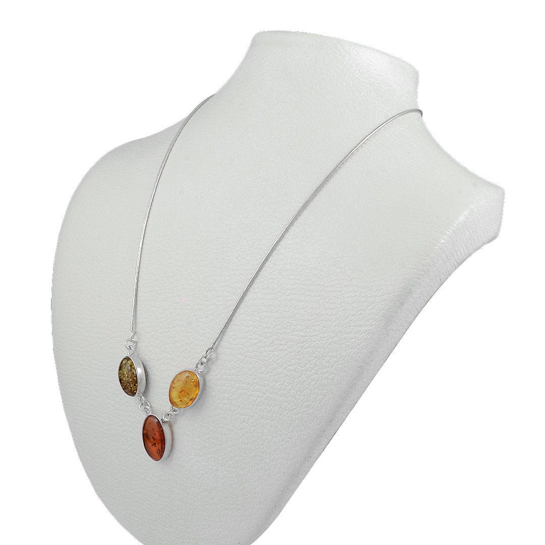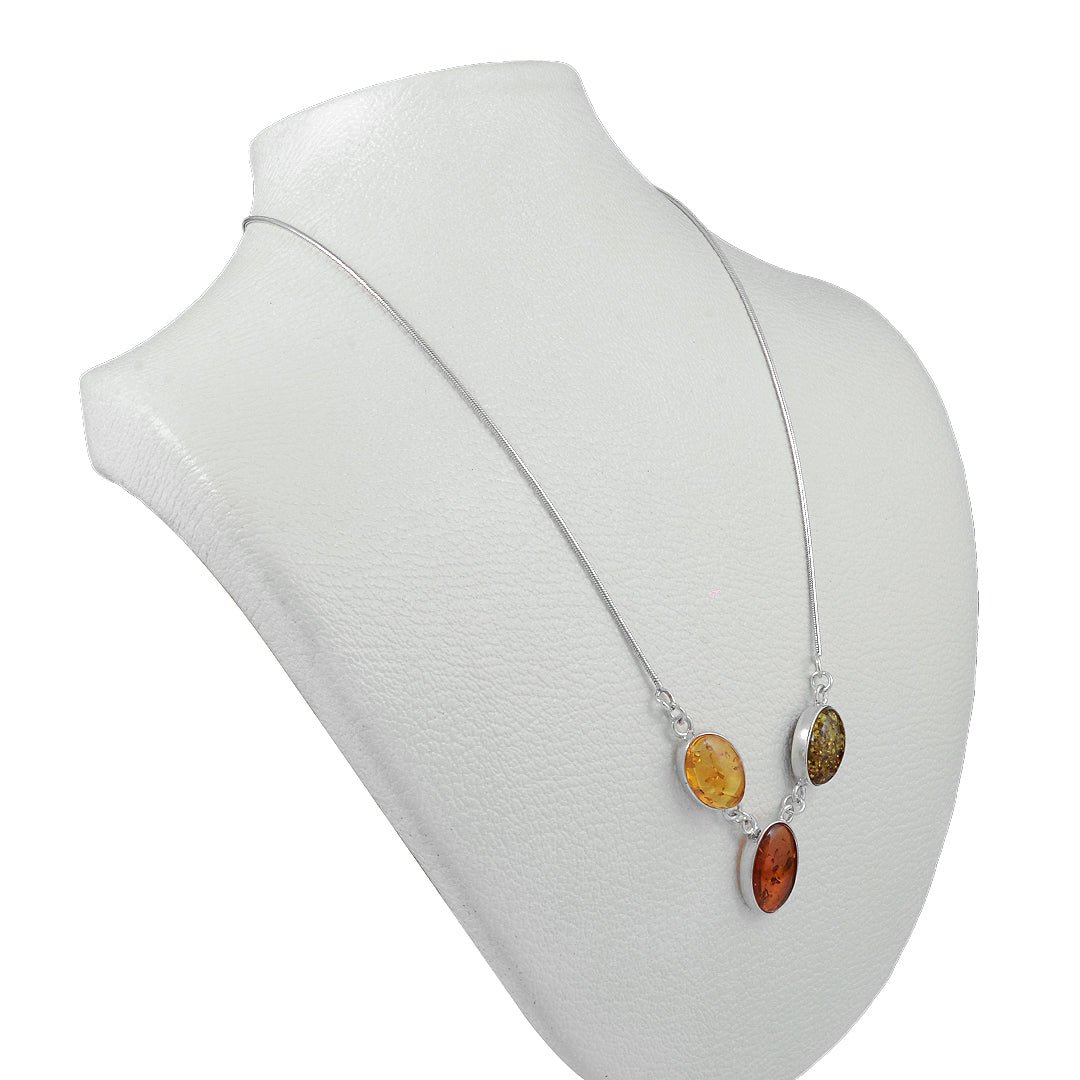 This amber silver necklace brings warmth, balance, and color in a graceful design. Crafted from 925 sterling silver, it features three oval amber stones in a soft gradient—honey yellow, deep cognac, and rich orange. Set horizontally along a polished chain, each stone glows gently, capturing light and enhancing the warmth of the skin beneath.