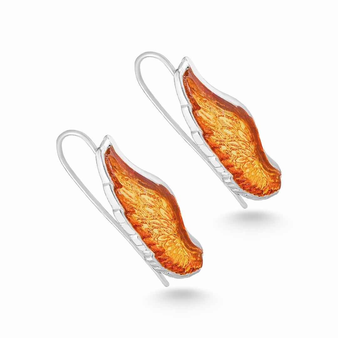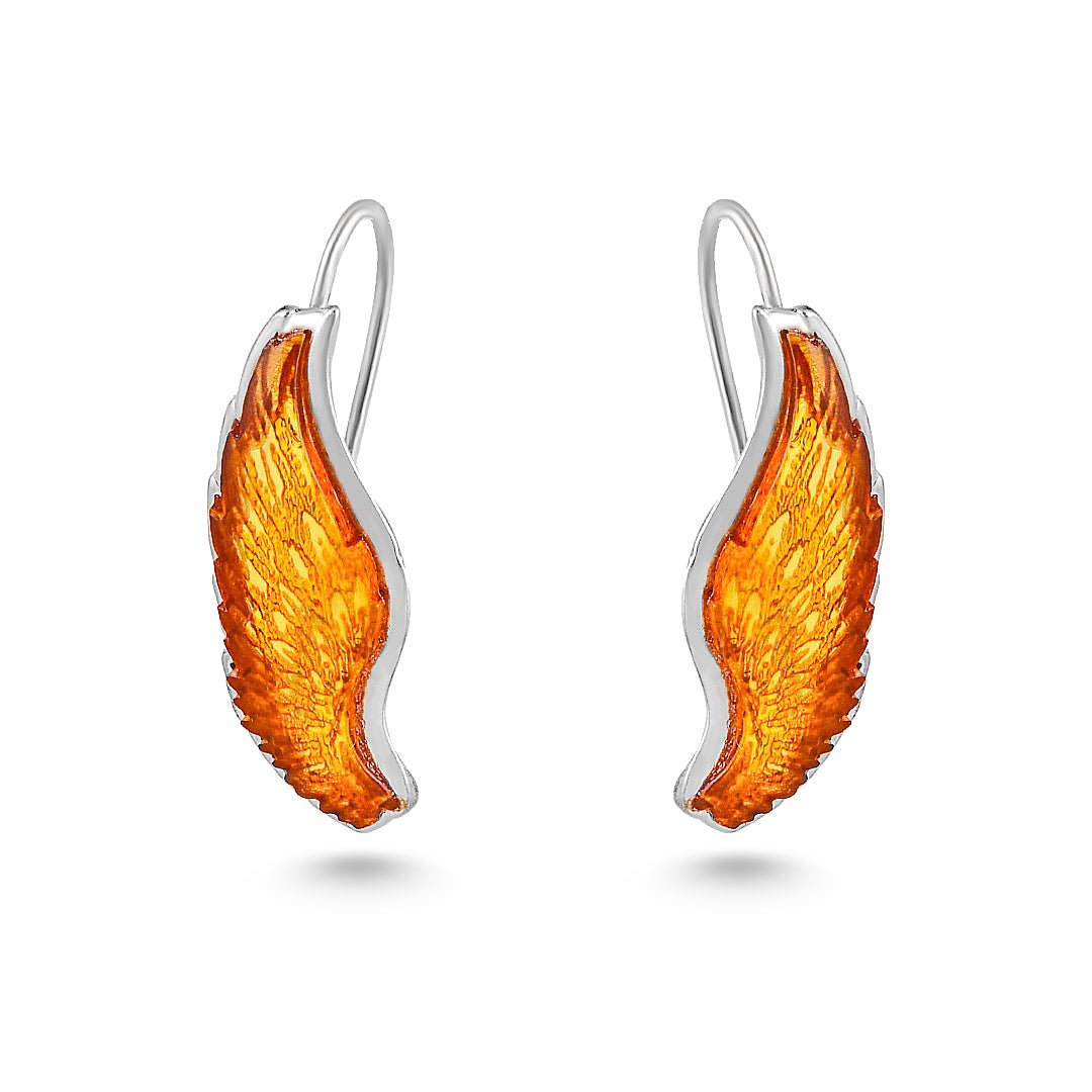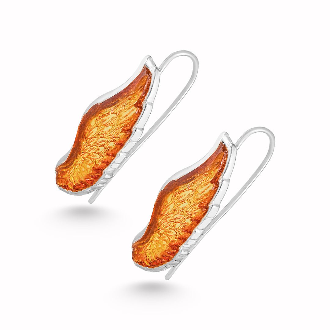 These amber wing earrings channel warmth and motion in a sculptural form. Crafted from 925 sterling silver, each earring features a softly curved wing-like shape accented with fiery amber. The result is a light yet expressive design that moves naturally and adds a glowing focal point.