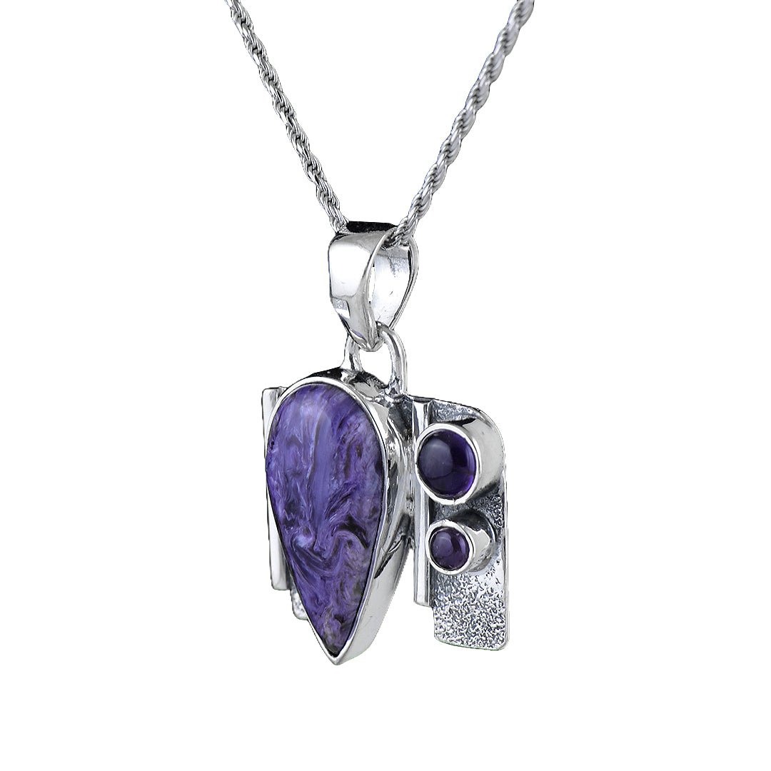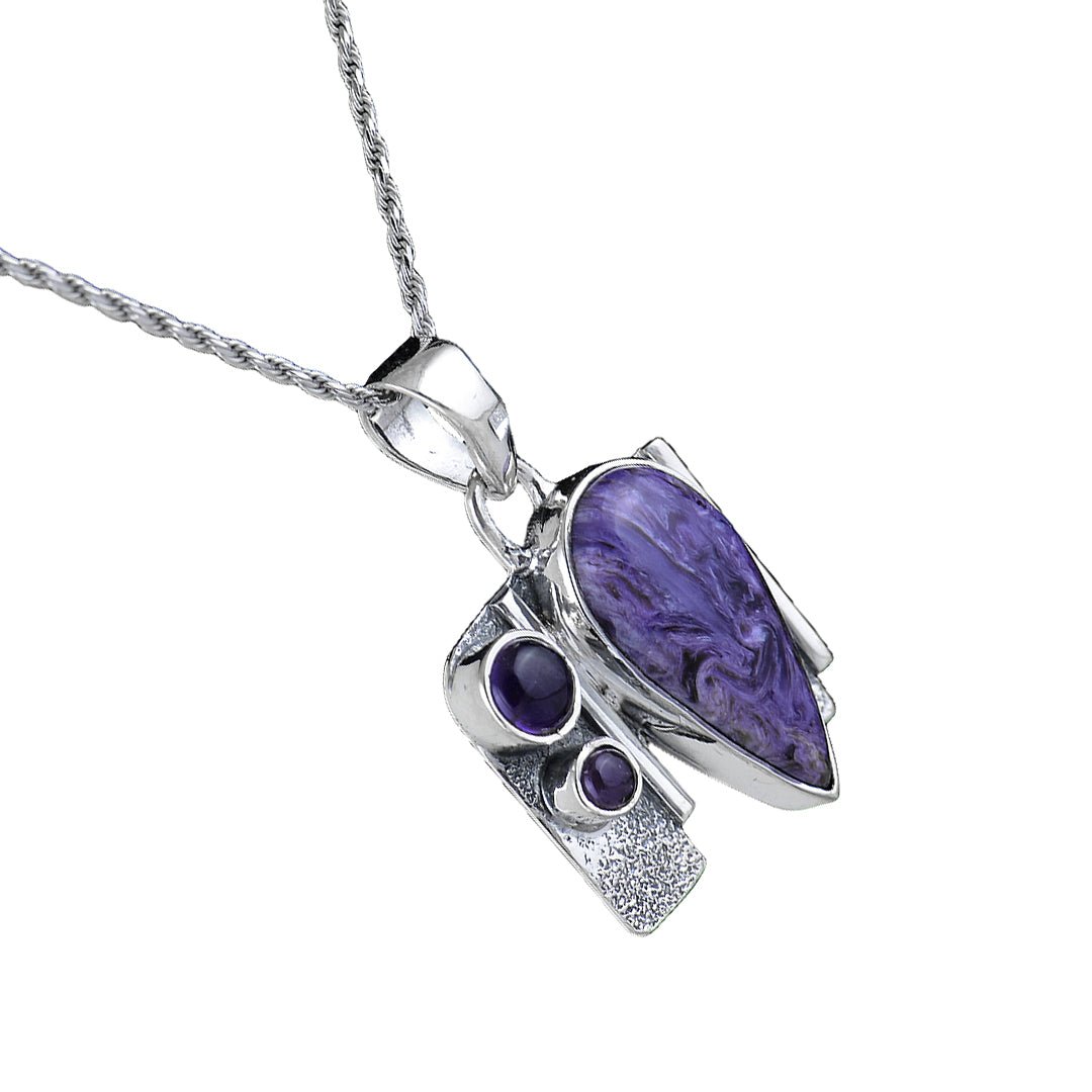This silver and amethyst pendant blends graceful lines with a vivid central stone. Crafted from 925 sterling silver, it weighs 7.76 grams and offers a polished surface that catches the light with ease. The design feels balanced and sculptural, making it an elegant piece suitable for both everyday wear and special occasions.
