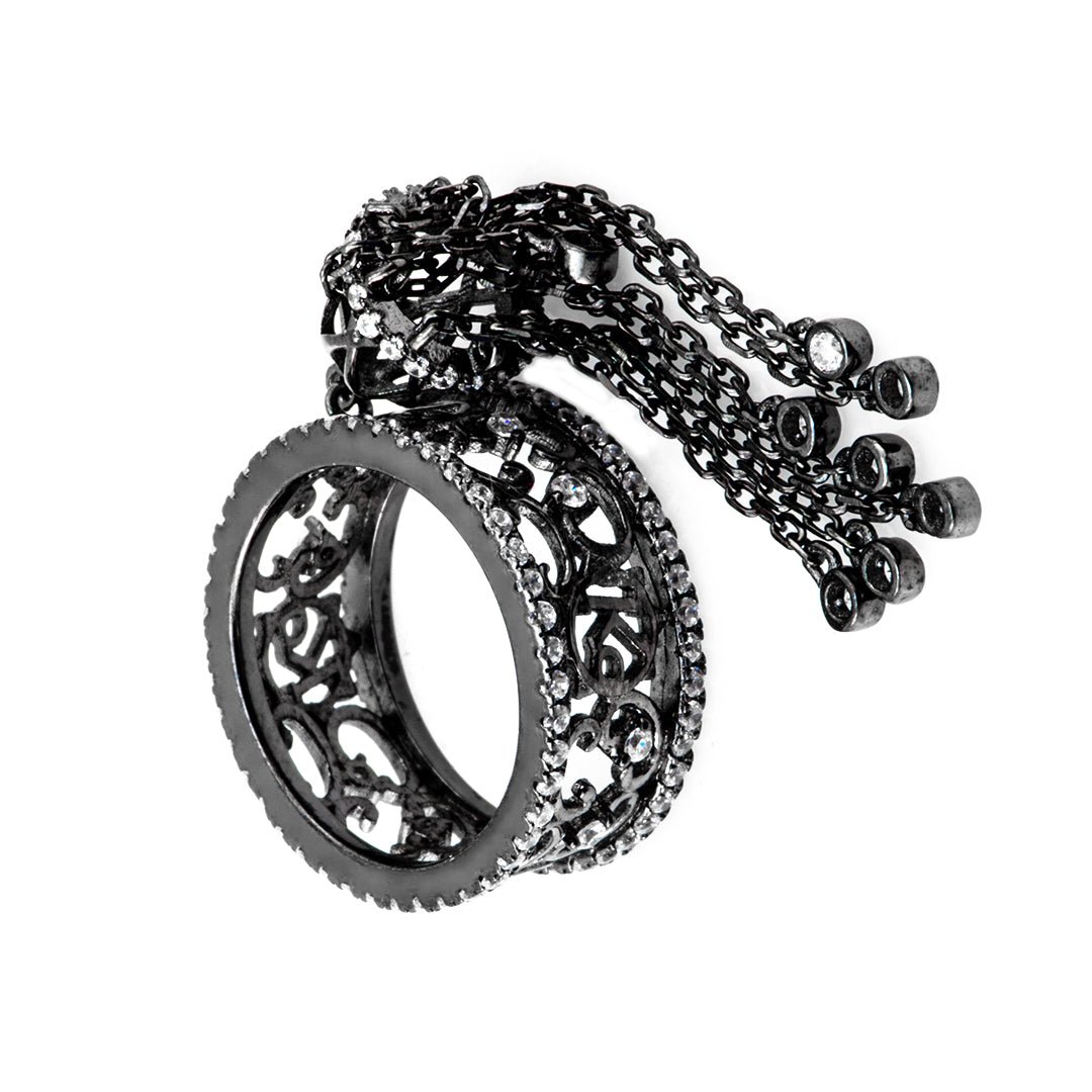 The chain motif wraps the finger in an edgy yet refined silhouette. Each curve and link has been shaped with precision, offering both comfort and design integrity. Furthermore, the blackened silver finish enhances the sculptural shadows of the interlocked shapes. The bold, oxidized patina resists fading and adds character over time. The ring feels confident and distinctive—perfect for those who like jewelry with attitude and depth.