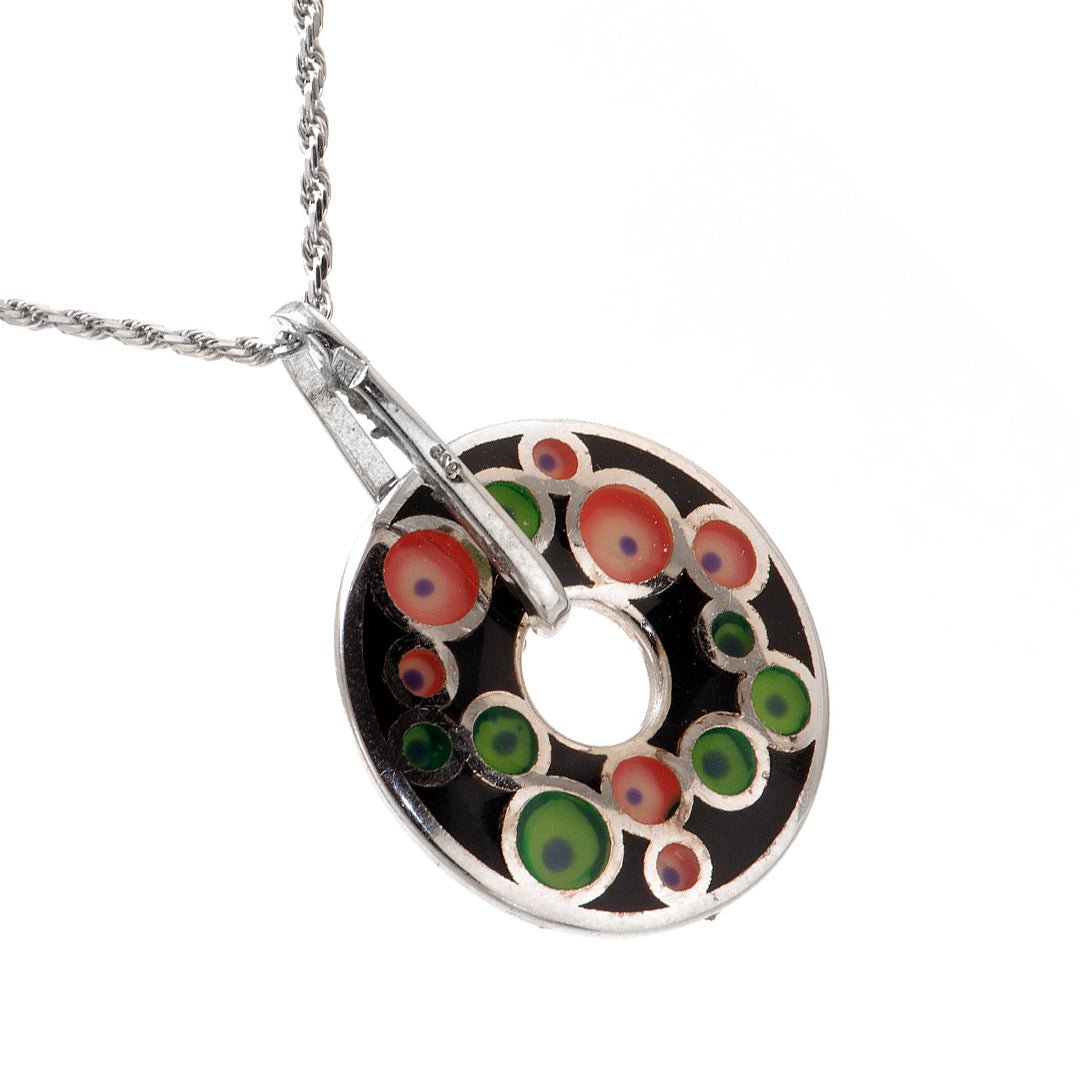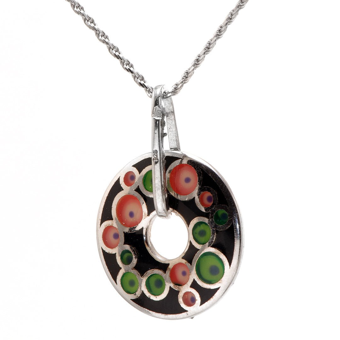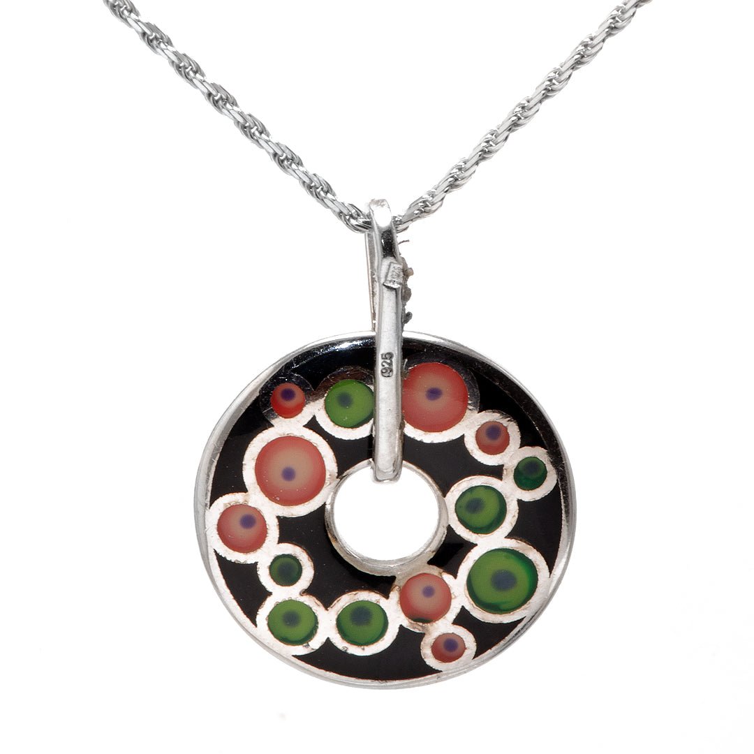 The Black Donut Shaped Silver Pendant with Colorful Patterns captures attention with its bold circular form. Crafted in 925 silver, it weighs 6.26 grams. The smooth black finish contrasts vividly with hand-applied motifs in red, blue, yellow, and green. Moreover, each pattern segment creates a rhythmic flow around the pendant’s center. As a result, it feels dynamic yet balanced. Consequently, this pendant transforms any look into a statement of modern art.