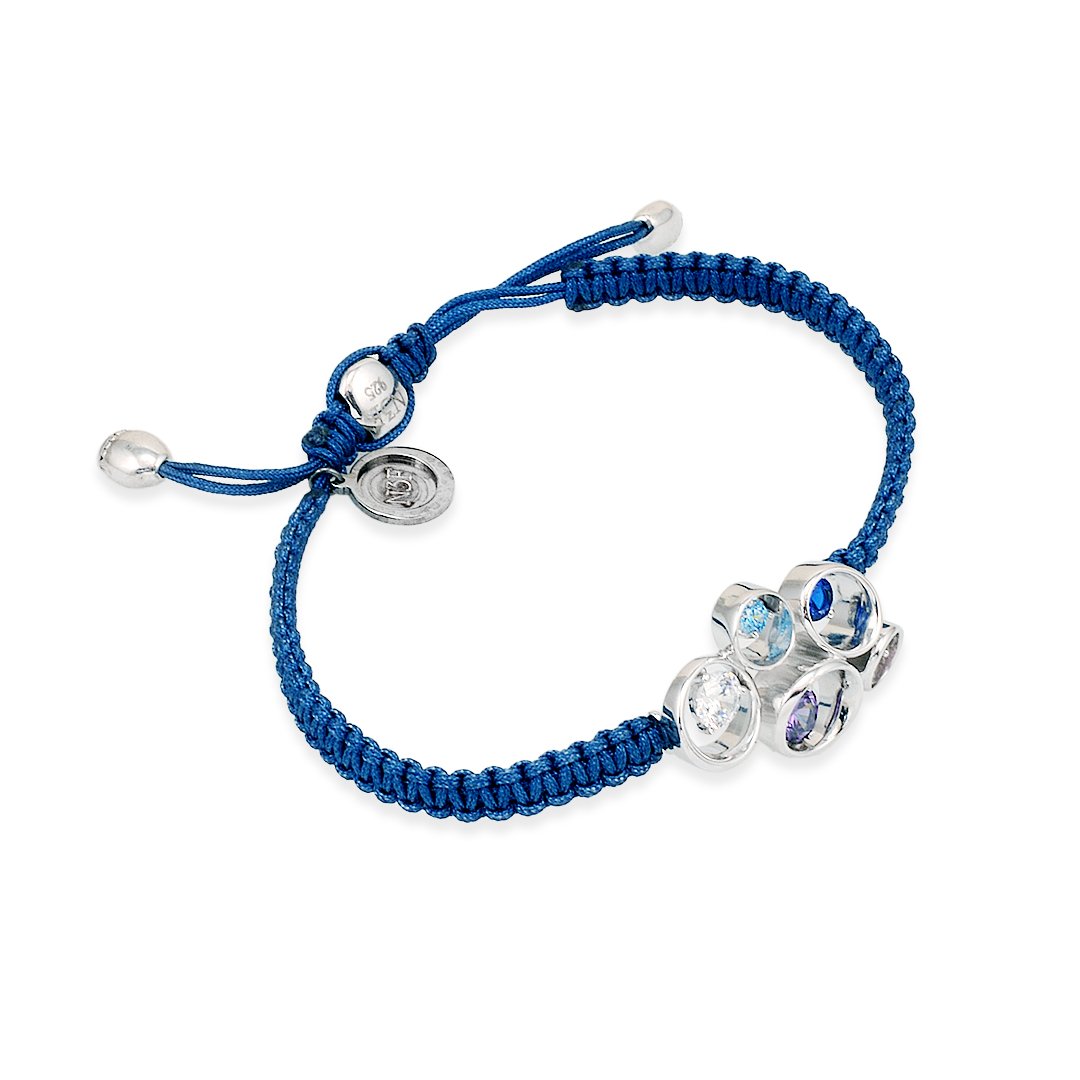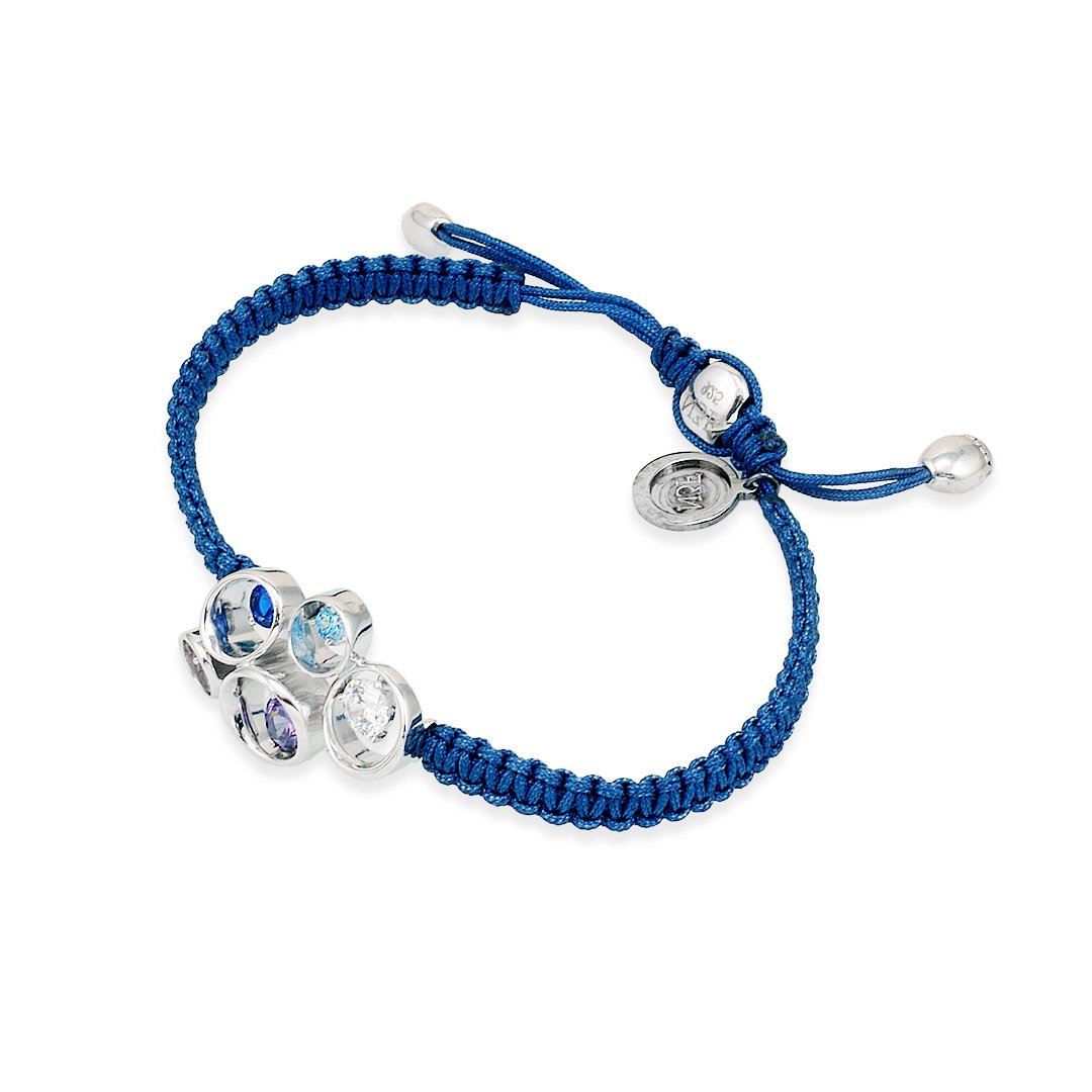 The bracelet’s structure centers on repeating silver circles, linked with a fluid motion that rests comfortably against the skin. Moreover, each segment is thoughtfully spaced to maintain both visual rhythm and a lightweight feel. Blue accents are embedded throughout, enhancing the circular forms with their cooling hue. The symmetry of the piece creates a sense of harmony and gentle balance that complements many different styles.
