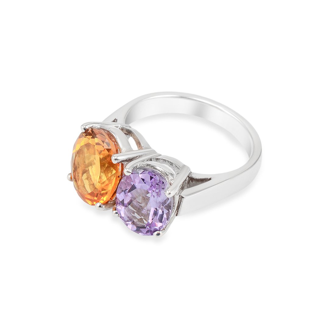 First, the golden citrine greets the eye with sunny warmth. Next, the purple amethyst adds rich contrast. Artisans match each stone’s cut and size precisely. Furthermore, they set the gems in slightly raised bezels for maximum light access. The band’s smooth curve guides focus across both stones. Additionally, polished silver bars separate the settings for visual clarity. As a result, the citrine amethyst ring feels sculptural and fluid at once.