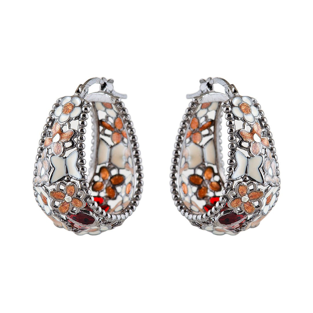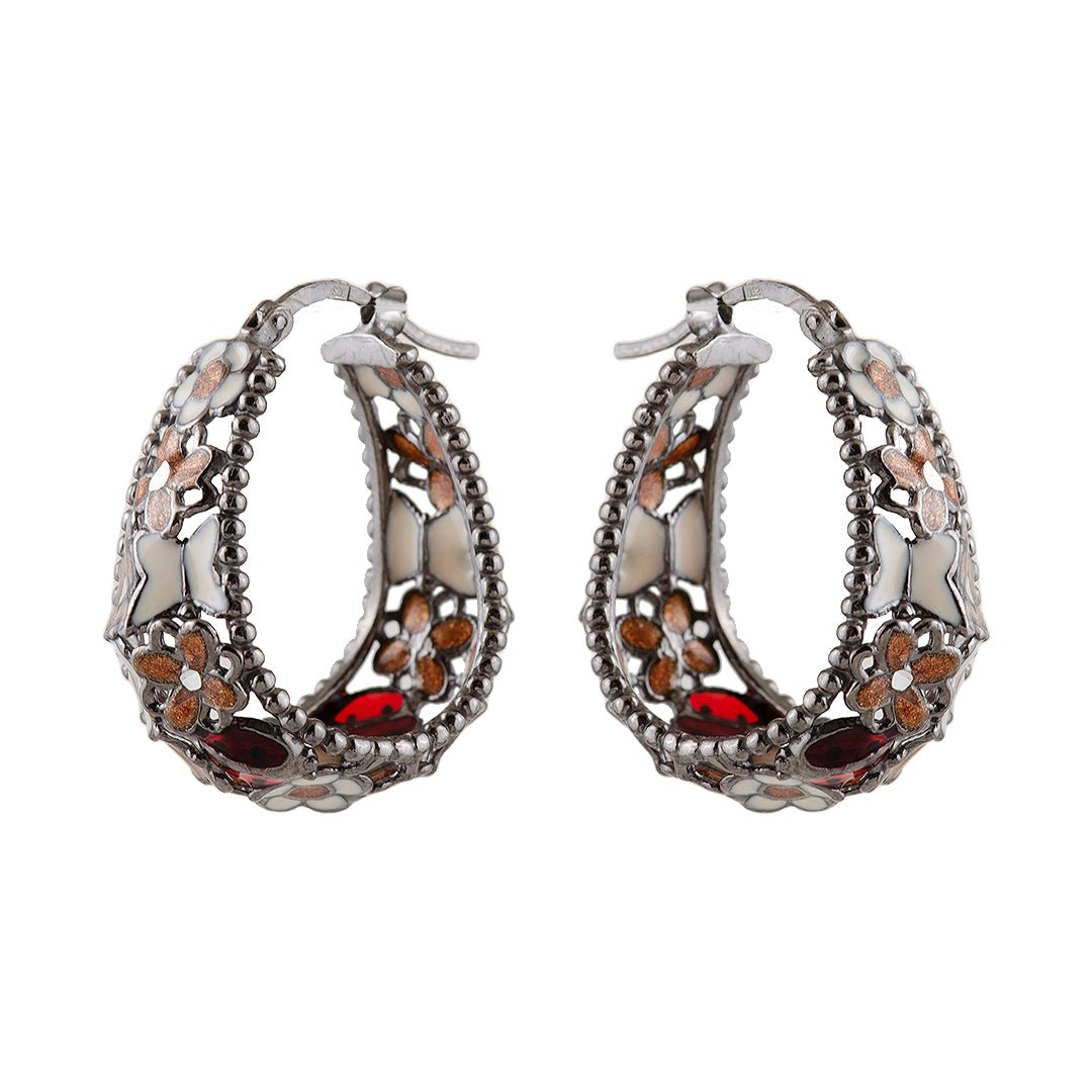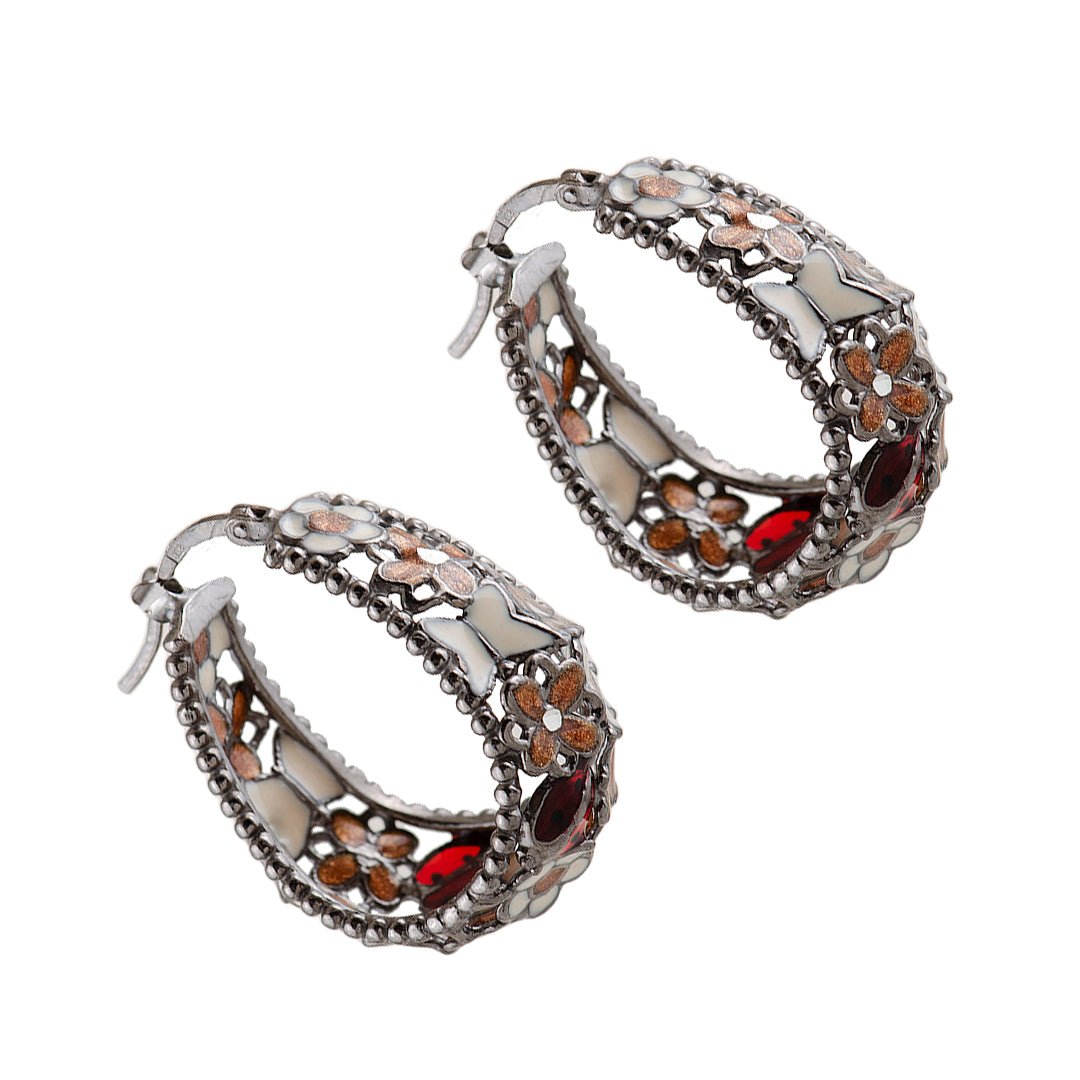 The flowers are artfully arranged to evoke a bouquet in full bloom. Colored enamel or man-made stones give the petals their distinct hues—soft pastels, vivid reds, or gentle purples. These layered blossoms create a charming texture and dynamic effect. Additionally, the polished silver outlines each petal and secures the design in place. This thoughtful styling gives the colored flower earrings depth and movement while keeping a lightweight structure.