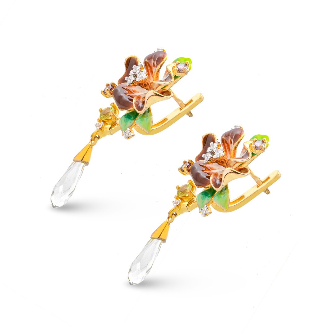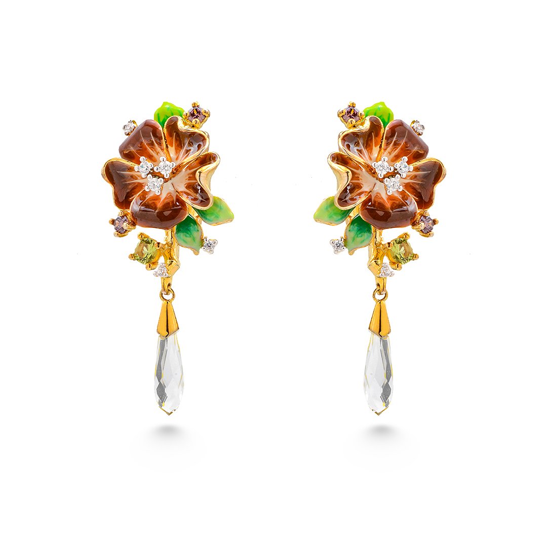 The upper flower element is shaped with curved petals and a warm brown tone. This natural motif provides visual depth and a calming earthiness. Below, a faceted crystal drop reflects surrounding light. Moreover, the contrast between matte petal tones and glossy crystal adds sophistication. The dangling form moves gently with every step, enhancing the earrings’ lifelike presence. These design choices bring softness and rhythm to the overall silhouette.
