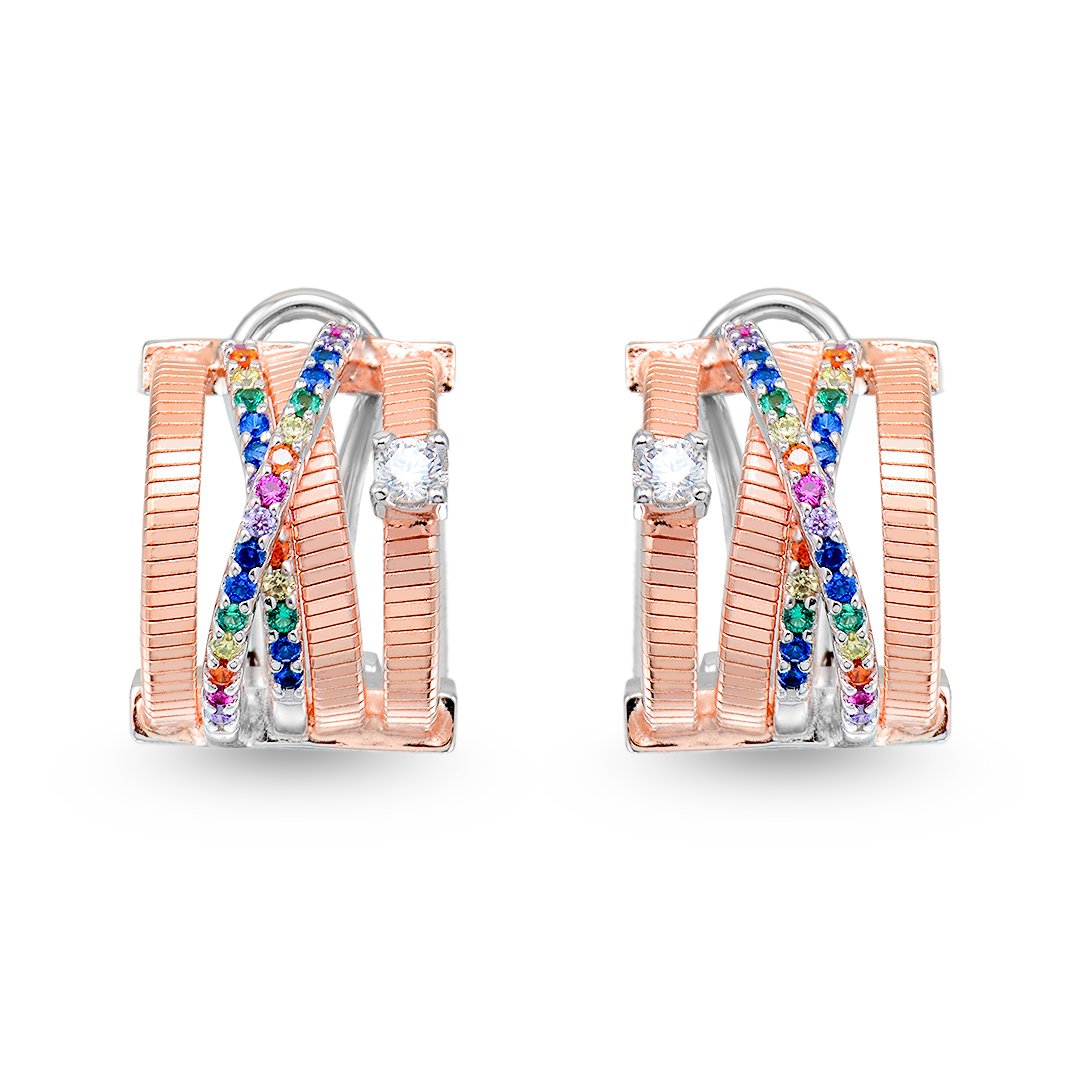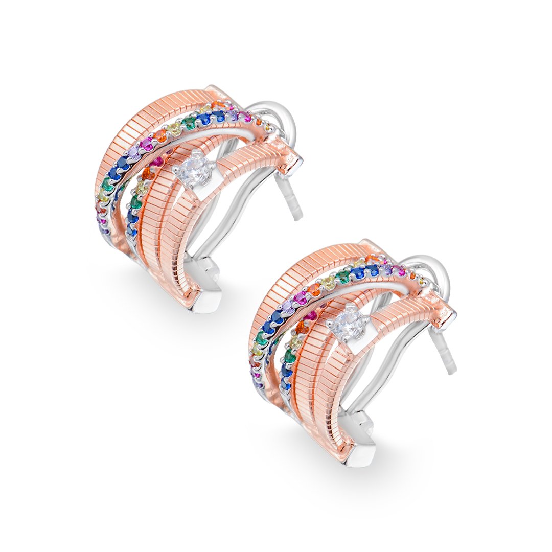 These crystal rose gold earrings bring delicate shimmer and refined color to your everyday style. Crafted from 925 sterling silver, they weigh 7.82 grams and are finished in a soft rose gold tone. The design centers on a smooth silver arc, accentuated by sparkling crystals that reflect light beautifully. As a result, these earrings feel polished without being overpowering. The crystal rose gold earrings combine warmth, sparkle, and minimalism in one graceful form.