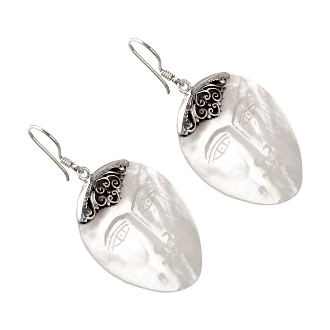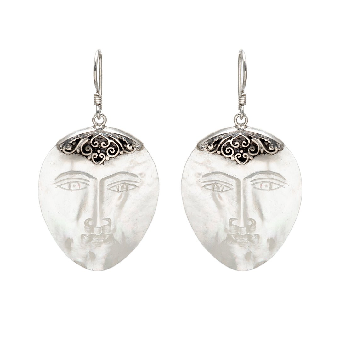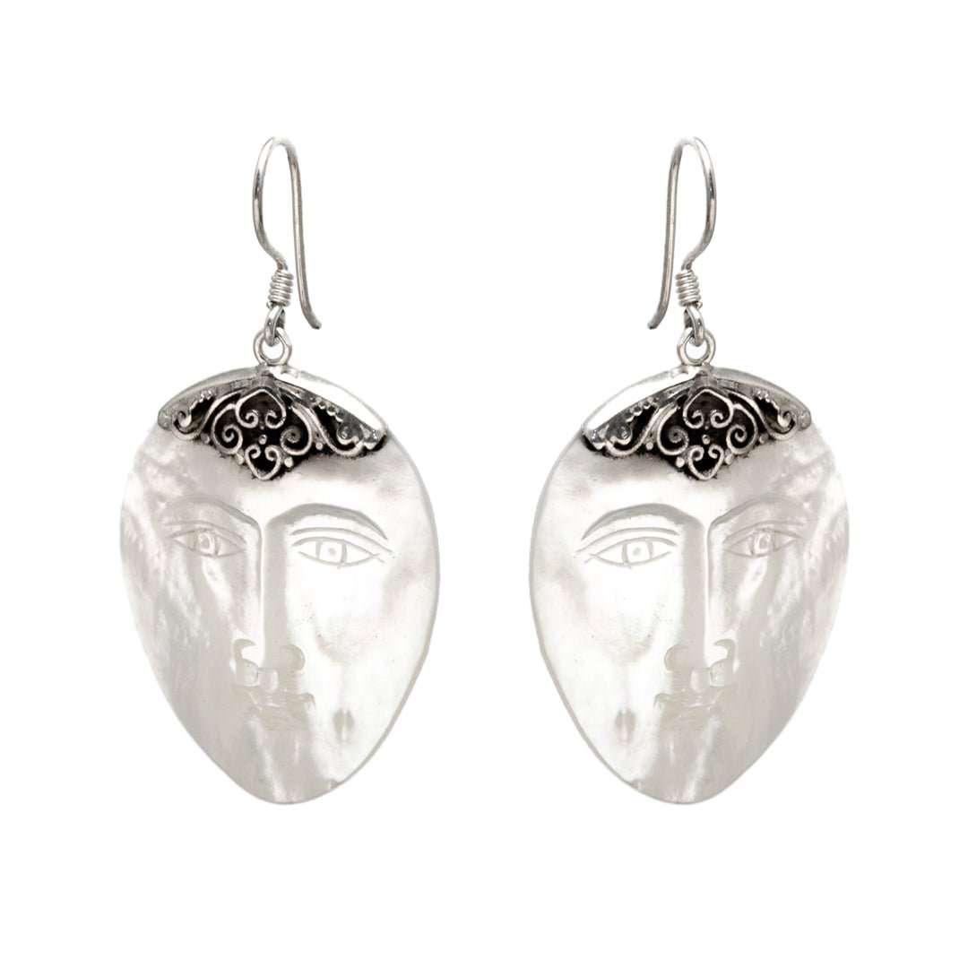These face pearl earrings bring sculpture to your look. Crafted from 925 sterling silver, each earring frames a hand‑carved face in mother of pearl. Moreover, soft iridescence shifts with every movement. As a result, they feel alive and inviting. You’ll love how light plays across their surfaces.