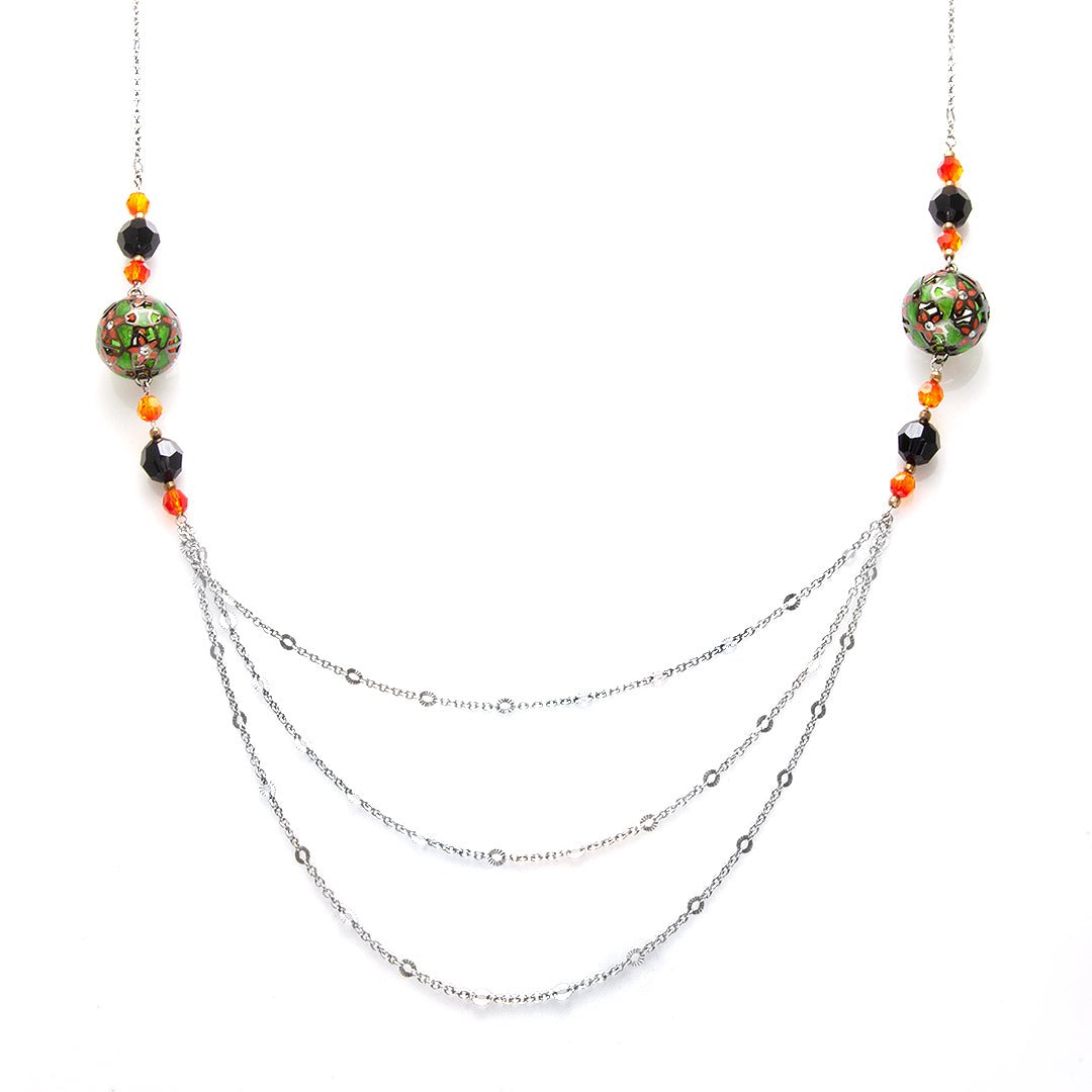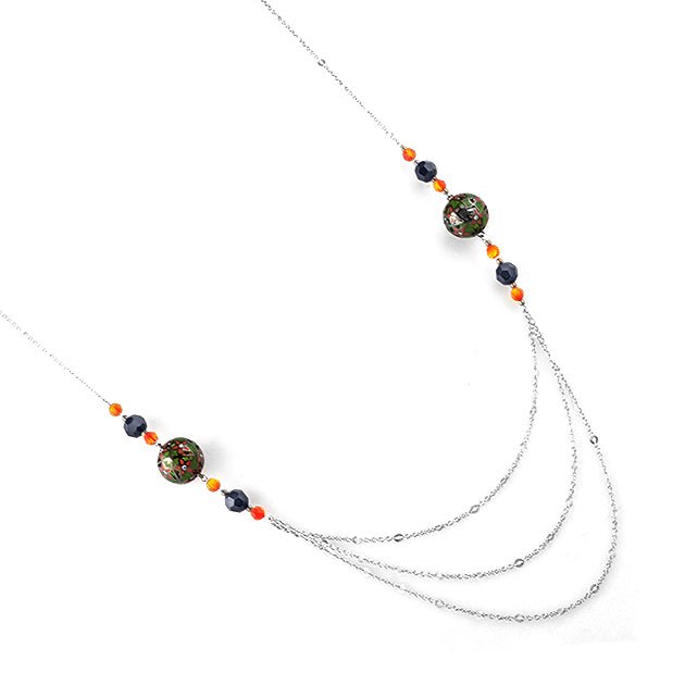 Each sphere carries a distinct floral pattern—some blooming, others abstract—offering layers of visual interest. The repetition of forms adds rhythm to the design while keeping the overall look clean and wearable. This is not a classic floral necklace; it’s a reimagined, architectural approach to nature-inspired jewelry.