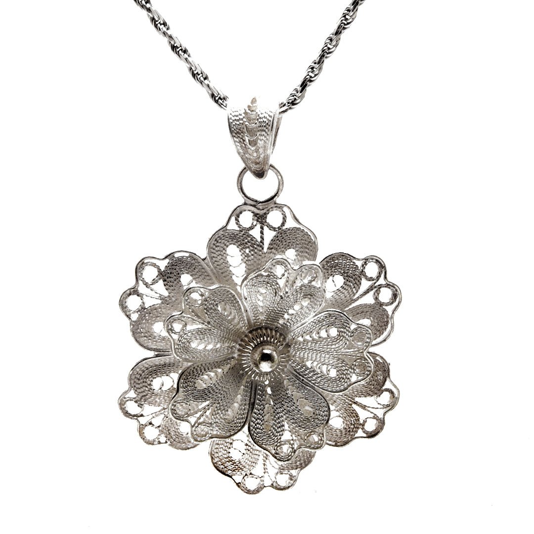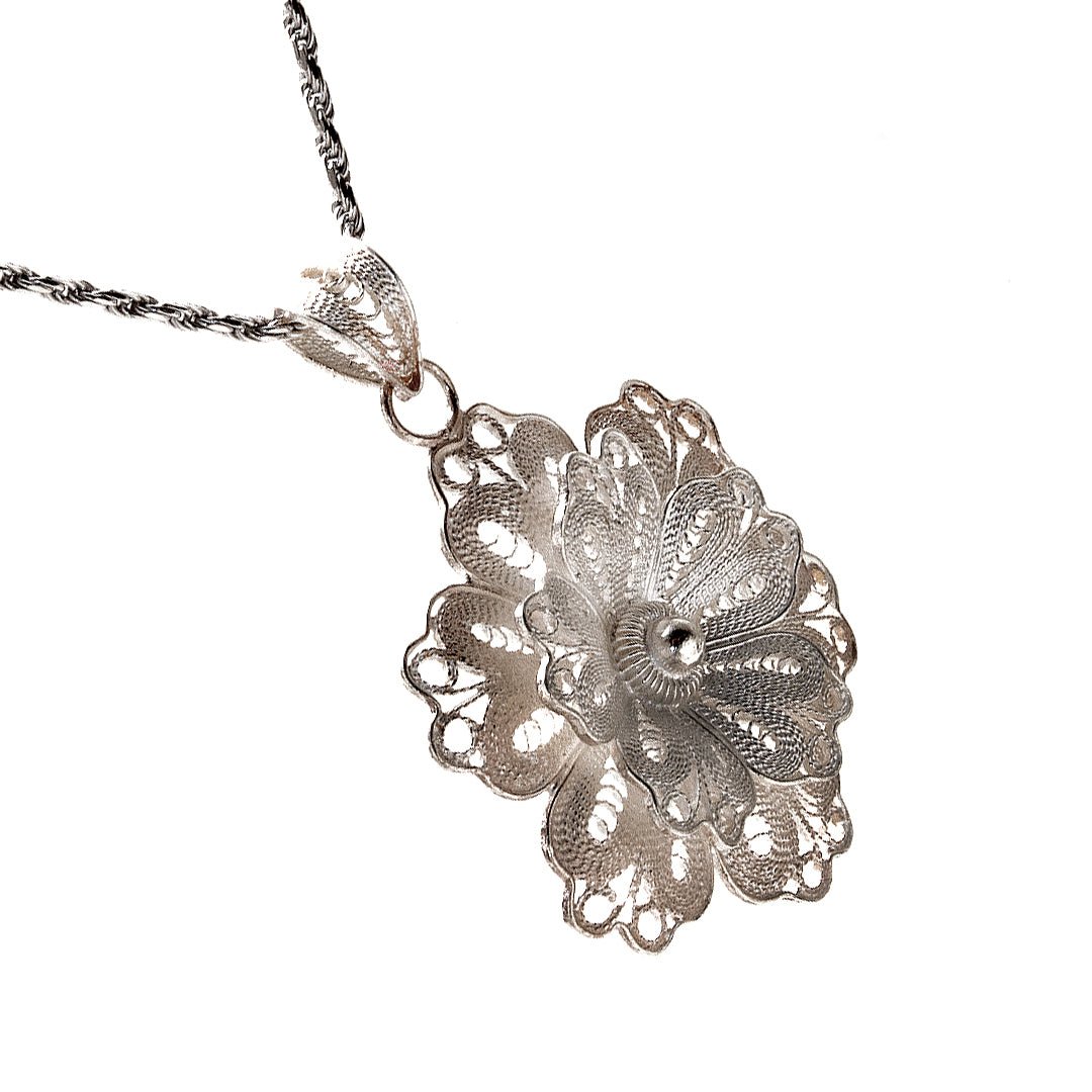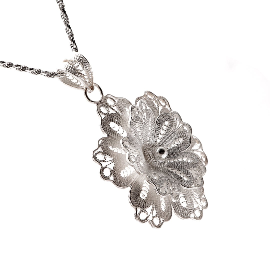 This flower layered silver pendant showcases sculpted petals in luminous gold-tone silver. Crafted in 925 sterling silver, it features overlapping layers that mimic blooming flowers. Moreover, each layer adds depth and visual interest. Consequently, the pendant feels dynamic yet balanced. Furthermore, its smooth edges ensure a comfortable fit against the skin.