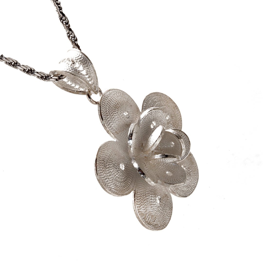 This pendant can elevate a simple blouse or add charm to a flowing dress. Whether worn with a fine chain or a more structured link, it adapts easily to different looks. The floral form suits casual wear, while the silver finish makes it appropriate for dressier settings as well. You can layer it or let it stand alone—either way, it brings softness and style.