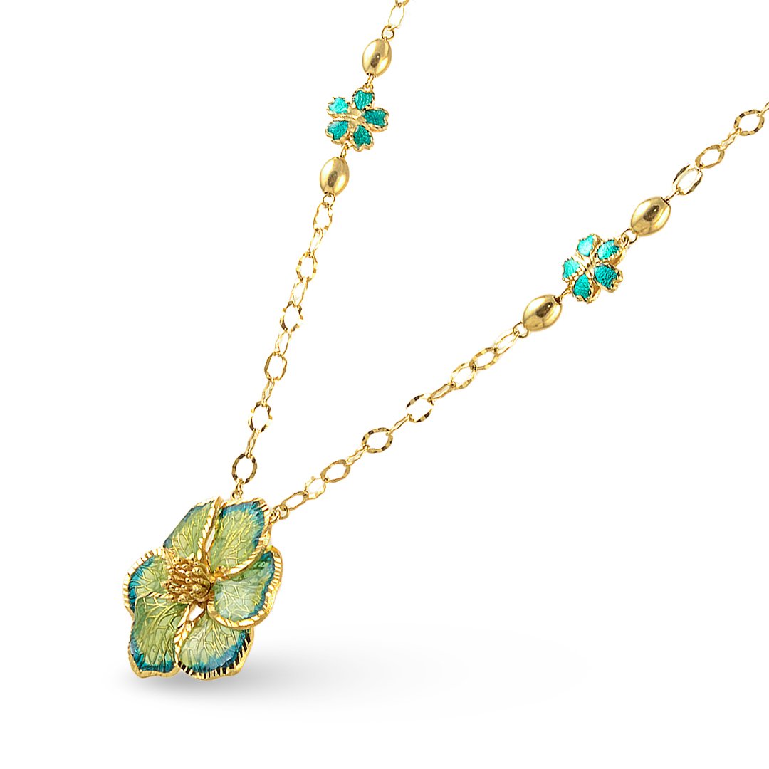 The delicate green tones breathe life into the sculpted silver. These soft accents highlight the petals and create natural contrast. The silver reflects light while the green adds quiet warmth. Every flower looks slightly different, giving the piece a handmade feel. This combination of metal and color makes the necklace glow in a subtle, organic way. You’ll notice its charm more and more each time you wear it.