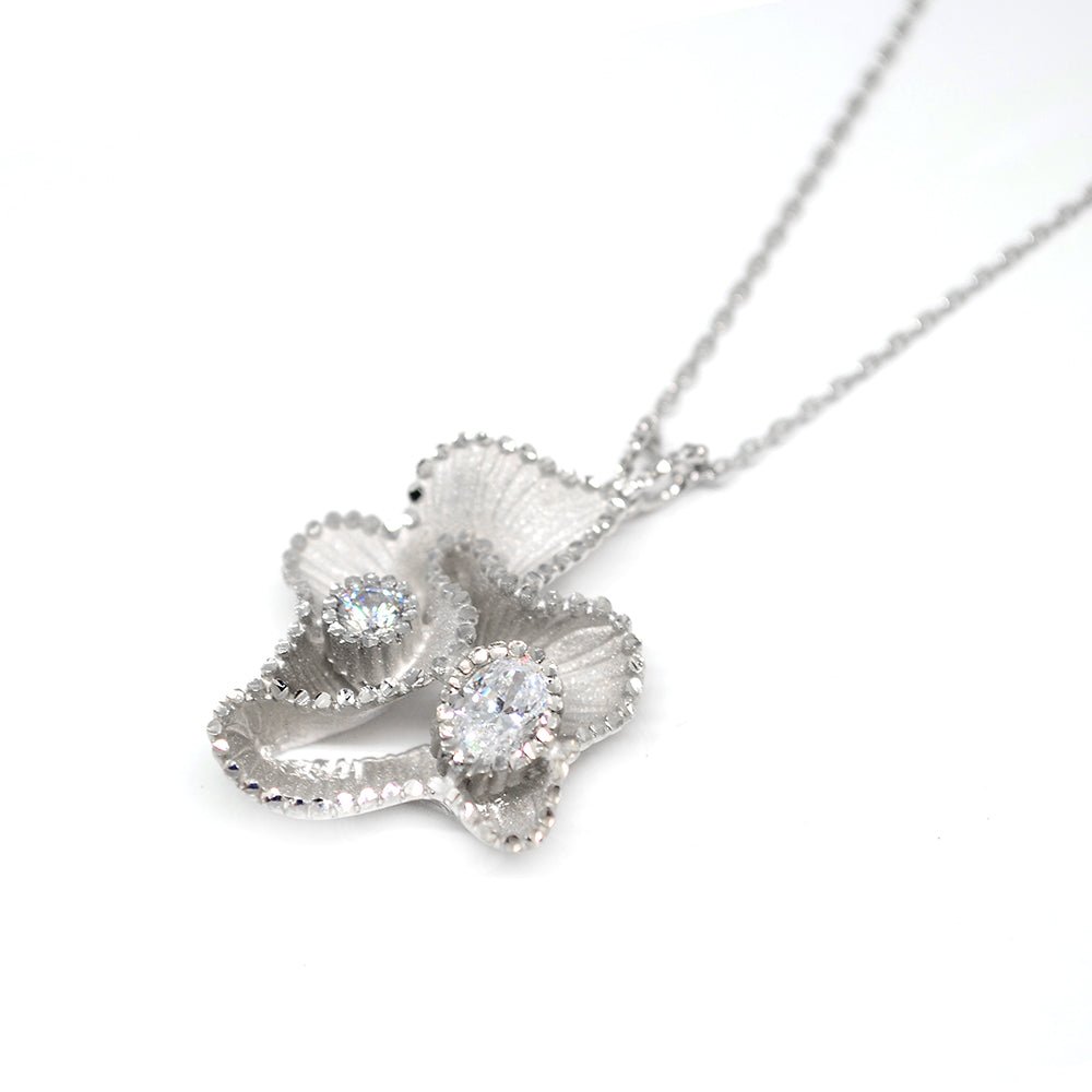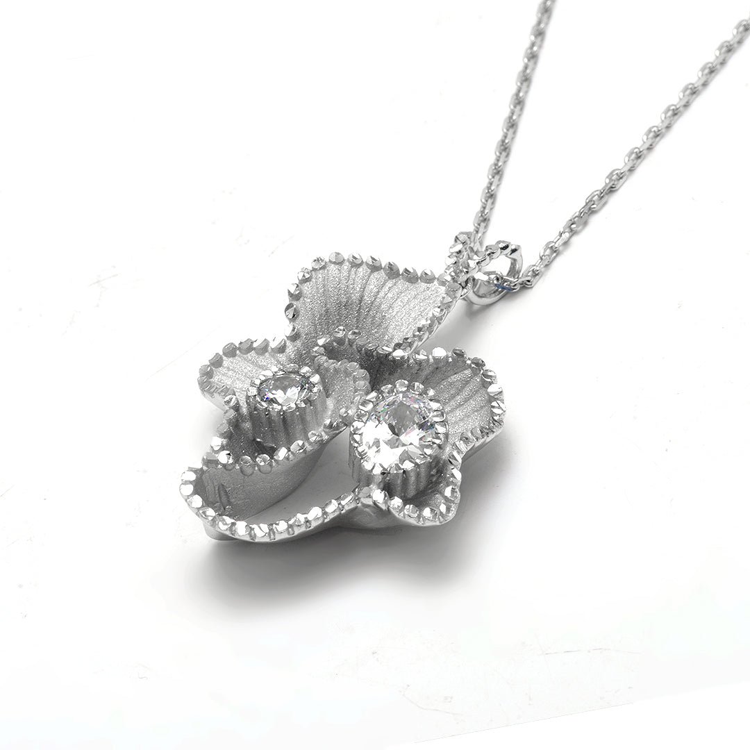 This grey flower necklace is a graceful fusion of bold silverwork and delicate floral beauty. Crafted in 925 sterling silver and weighing 10.60 grams, the design features a softly sculpted grey flower accented with a sparkling crystal center. Designed by Roberto Bravo, it brings a refined, artistic touch to floral jewelry. The grey flower necklace balances neutral tones and light-catching details, making it a versatile and elegant piece for both everyday and special wear.