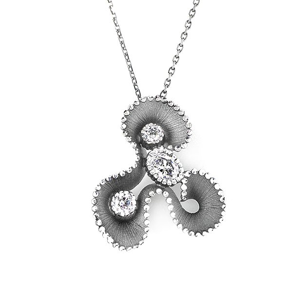 The grey flower acts as the heart of the piece, contrasting gently against the polished silver. Each petal is curved with intention, bringing organic flow to the geometric chain. As light moves across its surface, the piece reveals dimension and softness in equal measure. It feels timeless, yet quietly modern.