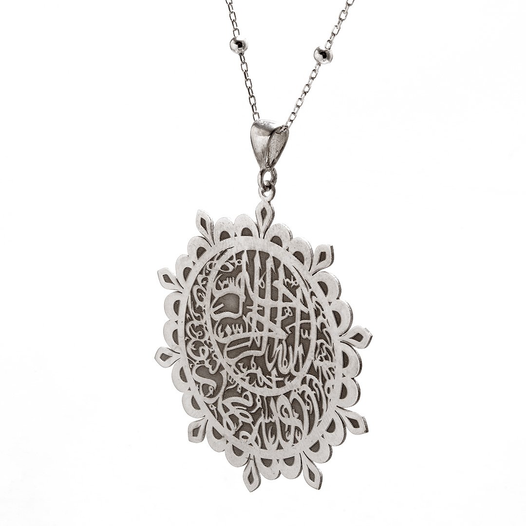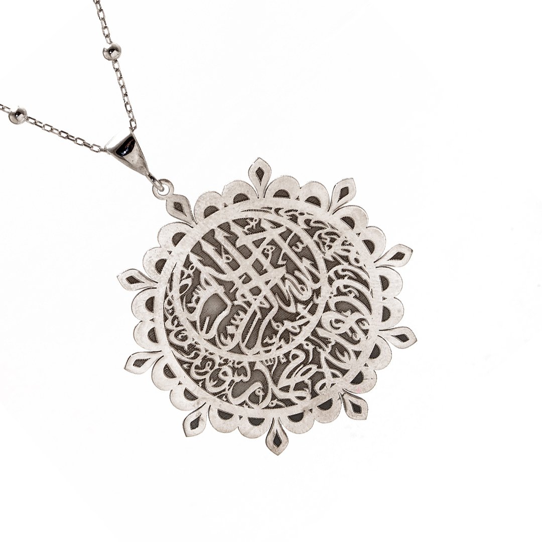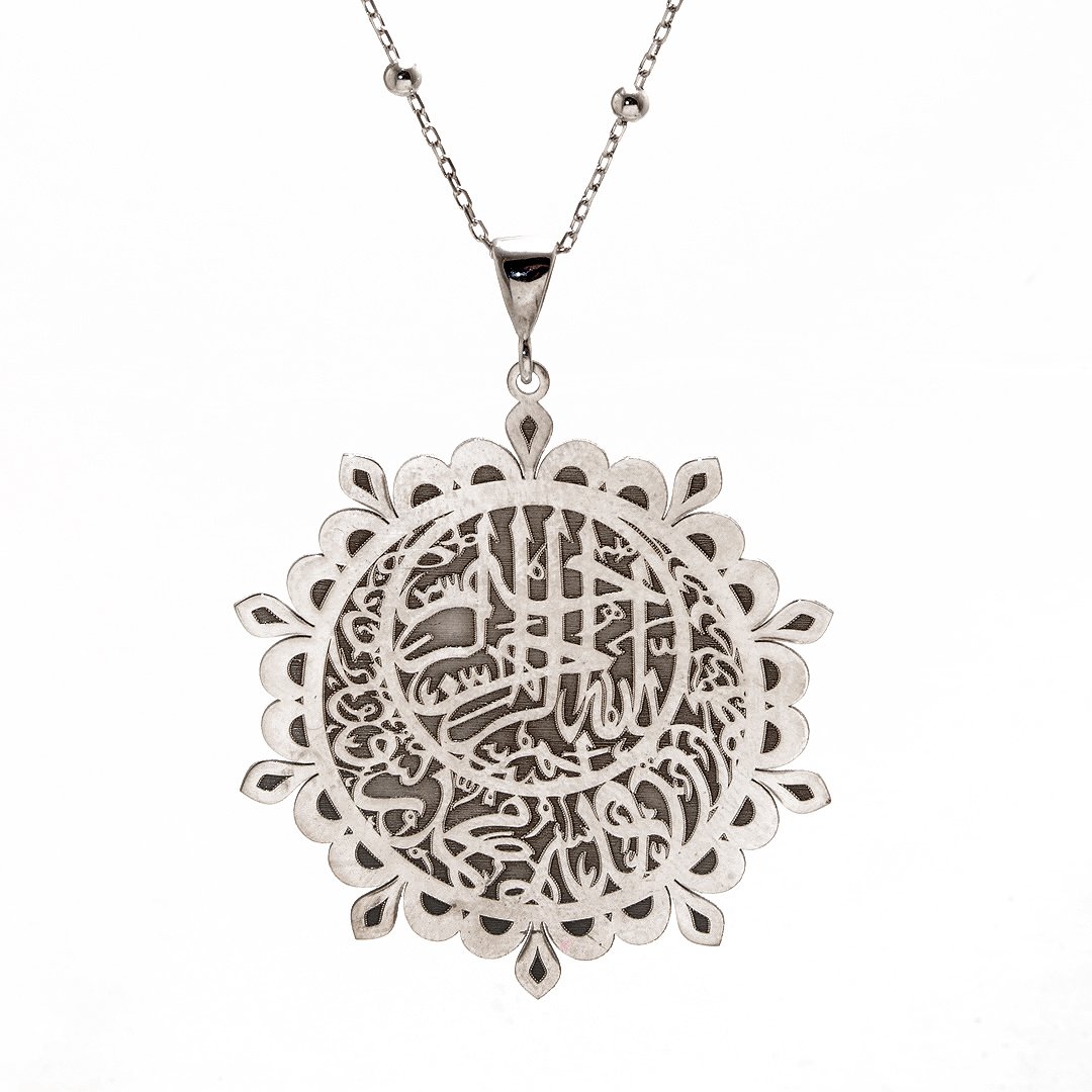 This islamic inscription silver necklace combines spiritual elegance with sleek design. Crafted in 925 sterling silver, it weighs 7.93 grams. The pendant features precise Arabic calligraphy that flows across a polished surface. Light dances over each engraved curve, revealing subtle shadows and highlights. As a talisman, it offers personal meaning. As jewelry, it brings refined polish and quiet confidence. This islamic inscription silver necklace adapts to any wardrobe, from casual to formal, and carries intention in every glance.