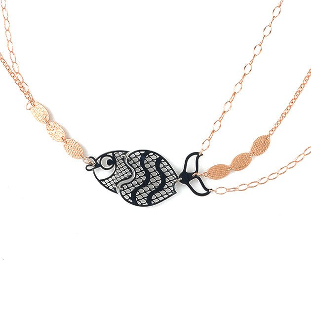Each fish is sculpted with fine lines that mimic scales and fins. Then, the high‑polish finish highlights every groove and curve. Furthermore, subtle texturing inside each form adds dimension and contrast. Consequently, the necklace offers visual interest from every angle. It feels like wearable art, rich in heritage and detail.