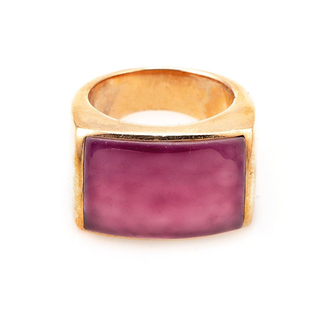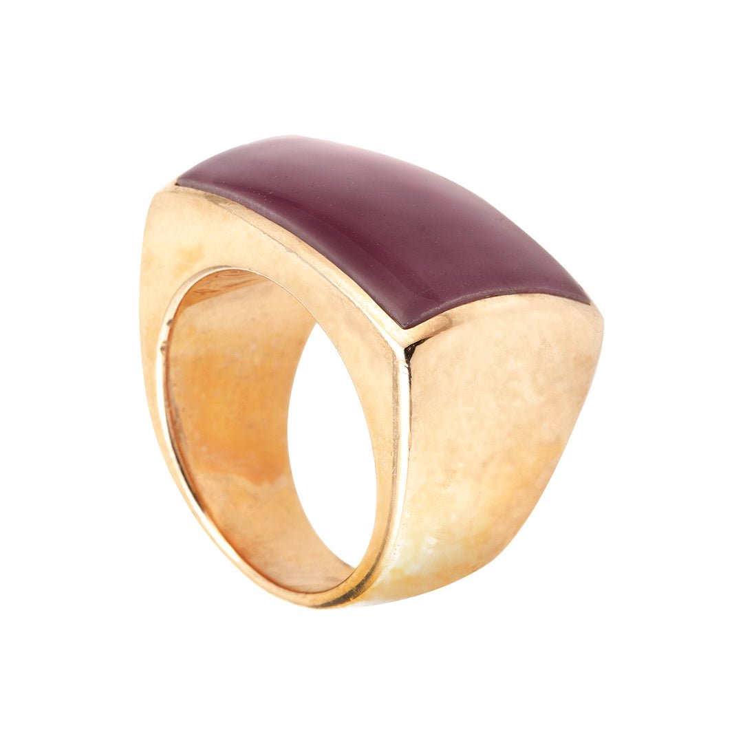 The band is wide yet curved to sit comfortably. Silver edges create definition between the enamel sections. Moreover, the maroon inlay shifts slightly in tone under the light. Meanwhile, the gold finish adds brightness that enhances the ring’s form. Each element works in harmony to bring structure and boldness. As a result, the piece appears powerful but never heavy-handed.
