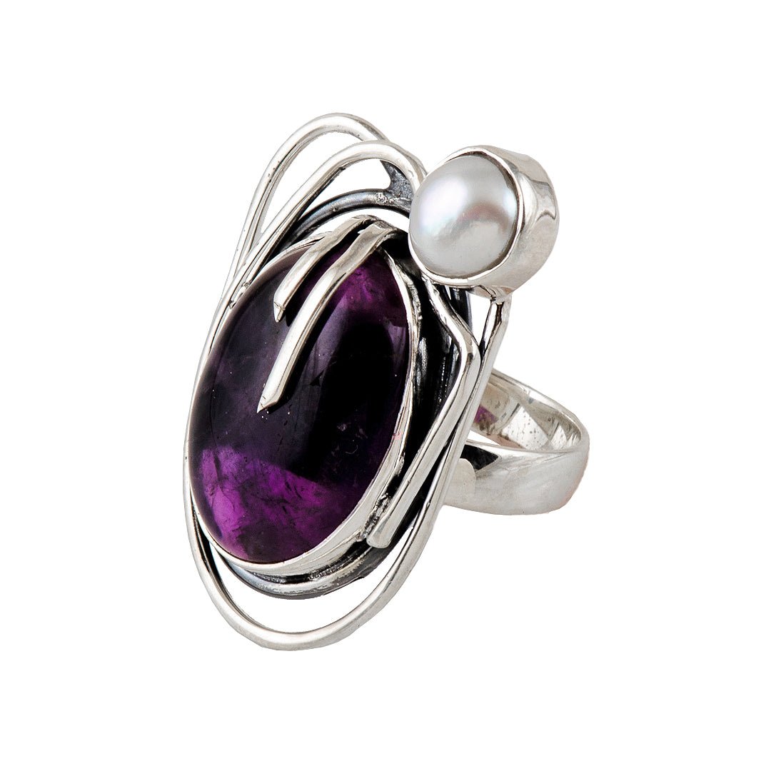 This mother of pearl amethyst silver ring pairs luminous shimmer with soft violet color in a sculpted silver silhouette. Crafted from 925 sterling silver, the ring weighs 13.60 grams, offering a substantial yet comfortable feel. At its center, a polished mother of pearl disc reflects iridescent tones, while a faceted amethyst provides gentle contrast. Together, they form a refined expression of color, shape, and light. This mother of pearl amethyst silver ring balances softness and structure with effortless grace.