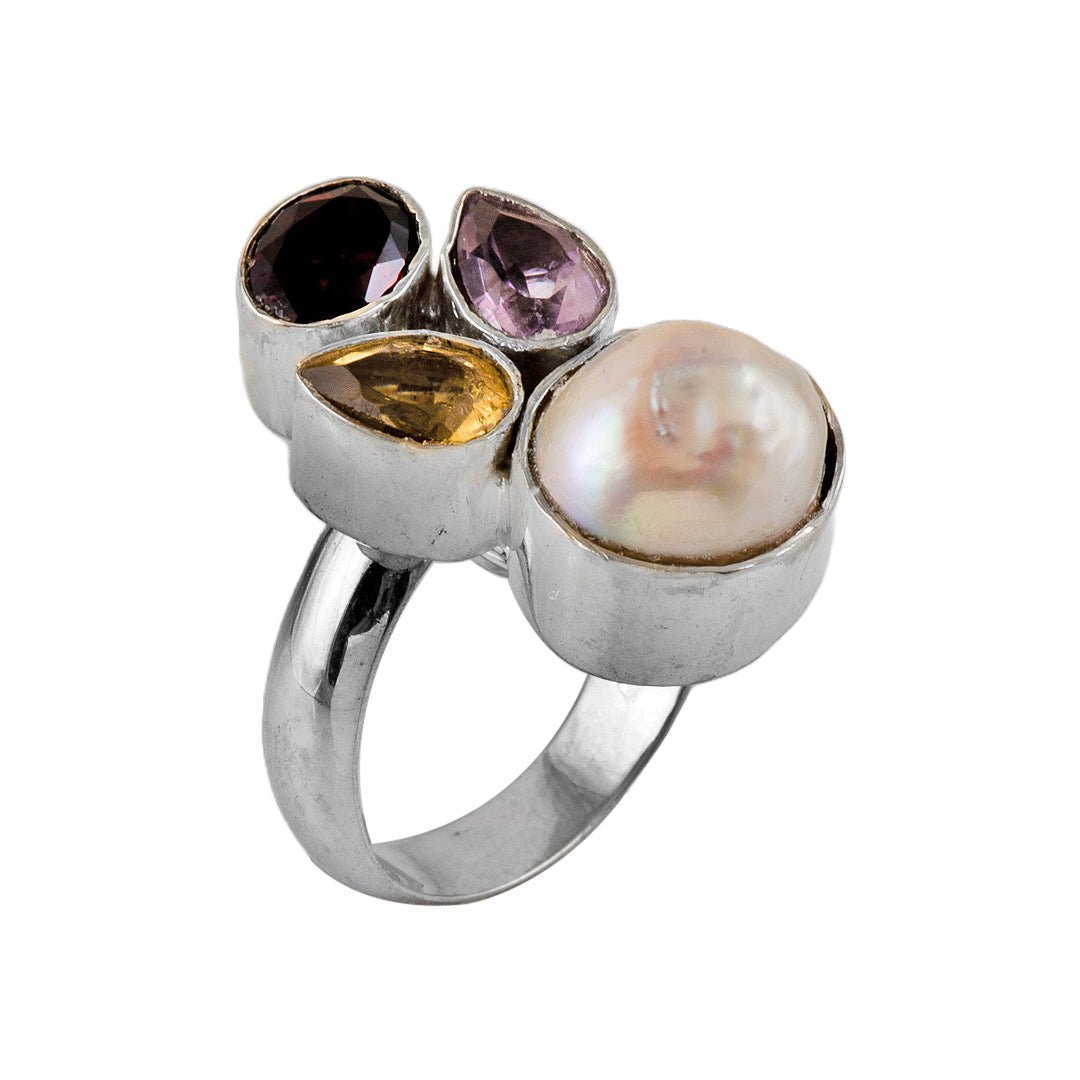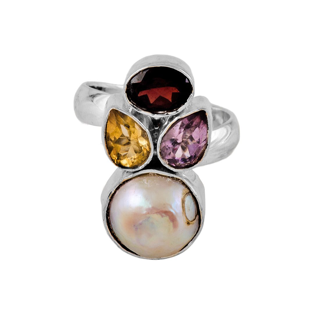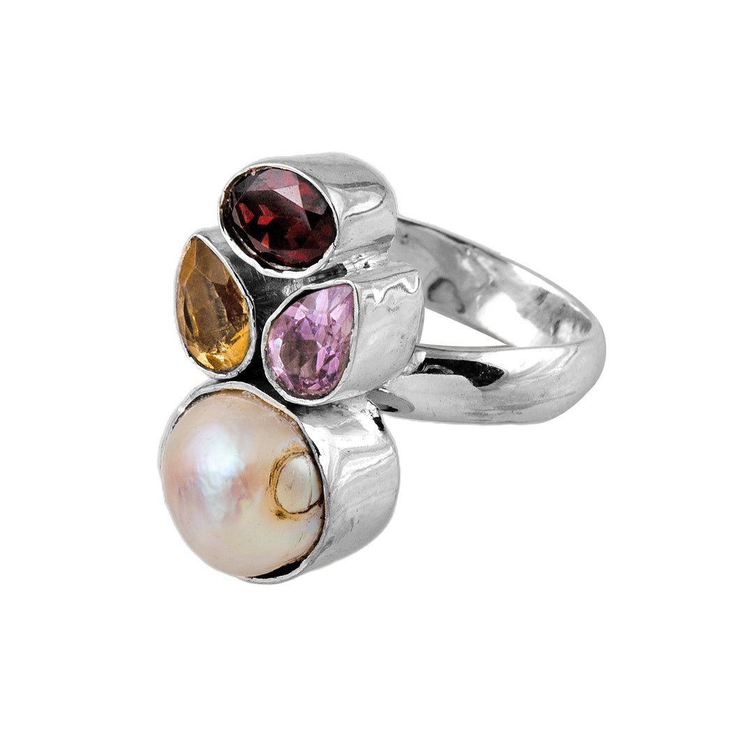 This mother of pearl gemstone silver ring brings together color, shine, and refined composition in a striking silver setting. Handcrafted in 925 sterling silver, the ring weighs 9.75 grams—balancing noticeable presence with all-day comfort. The luminous mother of pearl forms the central layer, surrounded by garnet, citrine, and amethyst stones. Altogether, this mother of pearl gemstone silver ring captures the essence of radiant elegance and artistic balance.