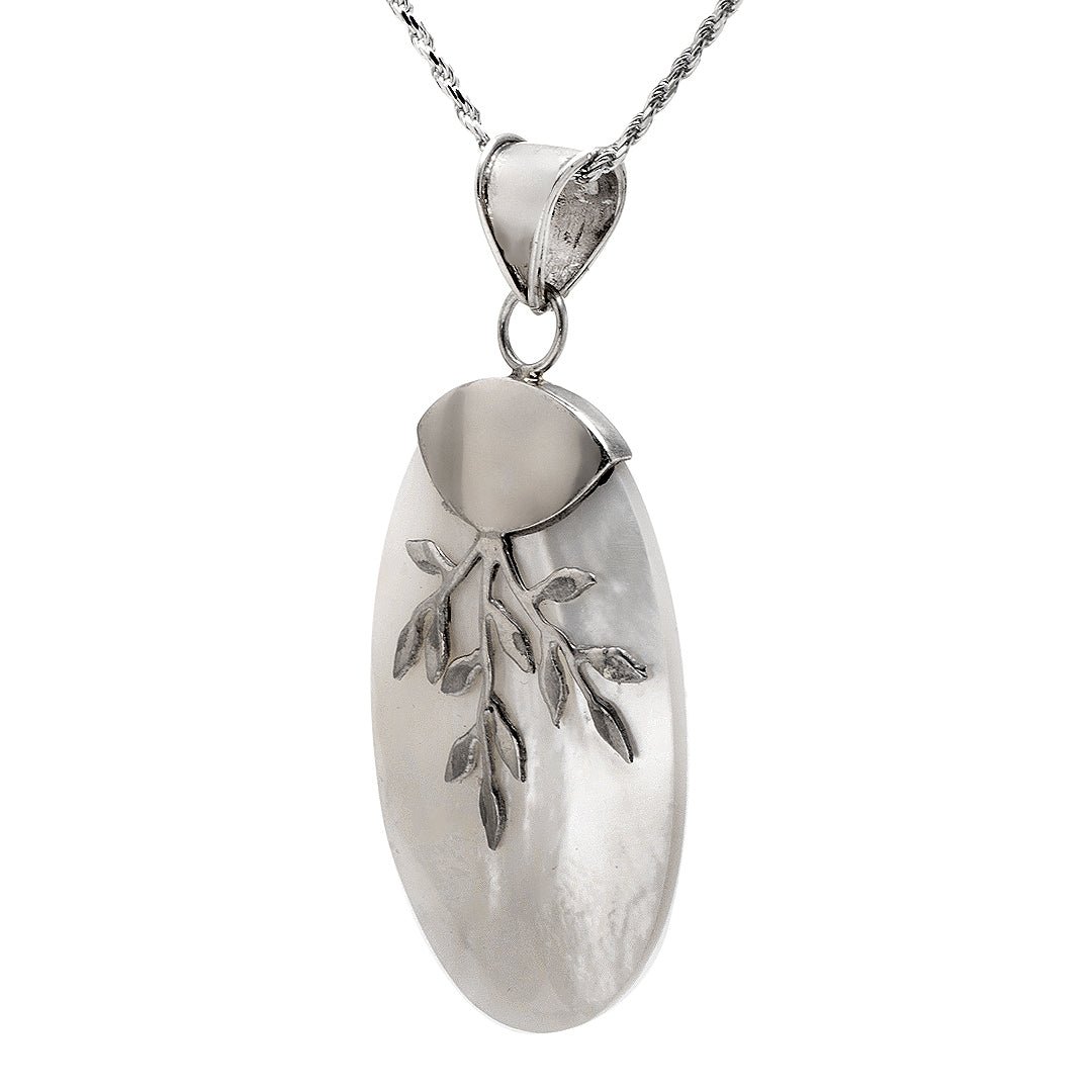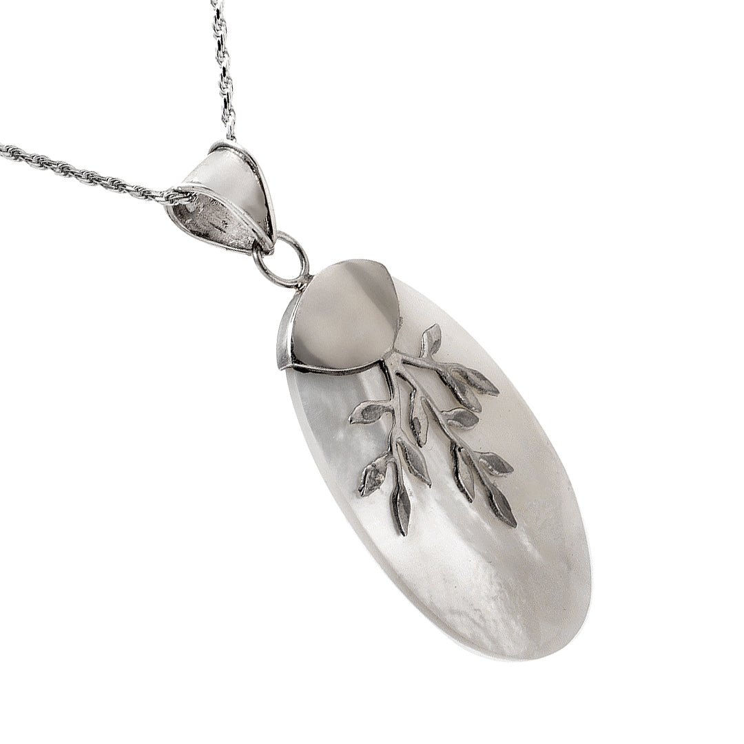 This mother of pearl pendant captures organic elegance through texture, light, and silver craftsmanship. Made of 925 sterling silver and weighing 6.95 grams, it features a luminous mother of pearl disc overlaid with a delicate vine motif. The natural shimmer of the shell contrasts with the soft matte and polished silver vines, resulting in a pendant that feels both fresh and timeless. This mother of pearl pendant celebrates the quiet beauty found in nature and is a graceful addition to any silver jewelry collection.