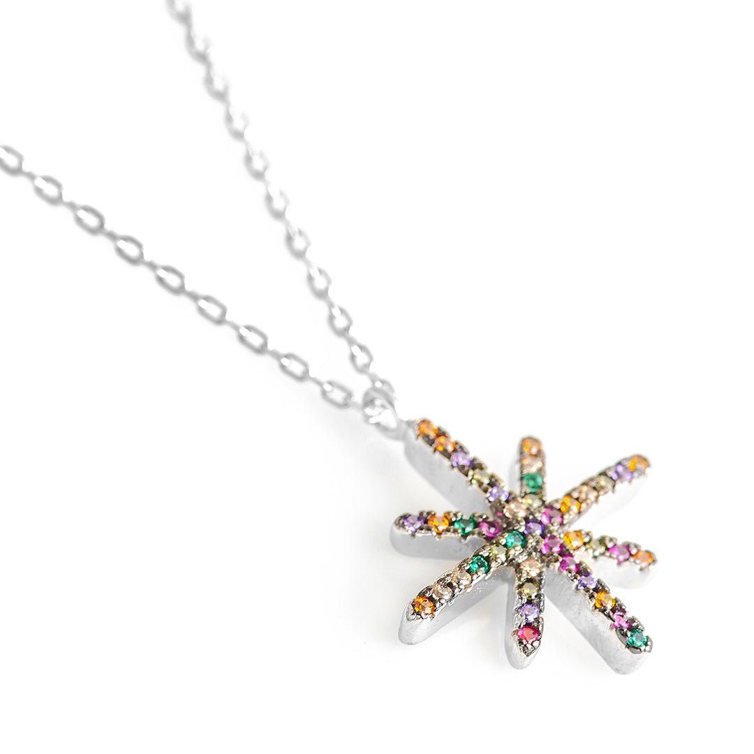 The Multi Colored Crystals Star Silver Necklace captures light and joy in a single piece. Its delicate star pendant shimmers with radiant, multi colored crystals that create an uplifting and luminous effect. Every crystal plays a role, together forming a constellation of color and light against the fine silver background.