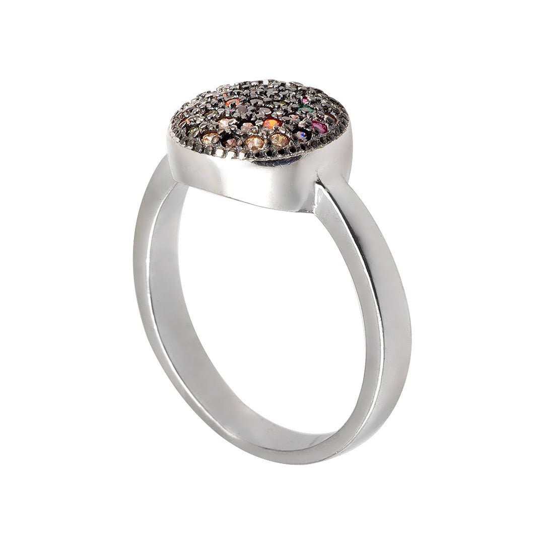The ring’s form emphasizes clean lines and balanced proportions, achieving understated refinement. A smooth band rises seamlessly into a minimalist setting that highlights the crystals. Each facet of the stones is intentionally exposed to maximize sparkle and clarity. Furthermore, the polished silver frame adds a subtle reflective glow that complements every hue. Additionally, the bezel design offers practical security without visual distraction. Notably, the simplicity highlights the ring’s modern edge. Consequently, the overall silhouette feels modern, versatile, and effortlessly chic for any jewelry collection.