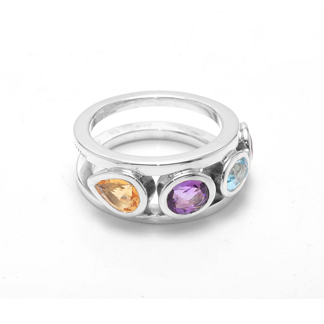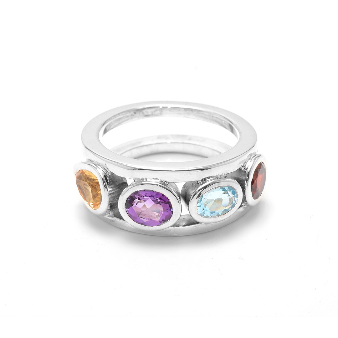 This multicolor gemstone band blends lively hues and sleek silver into one elegant piece. Crafted in 925 sterling silver and weighing 8.36 g, it feels substantial yet never heavy. Four natural gems—citrine, amethyst, blue topaz, and garnet—sit in open bezels that invite light to shine through each stone. As a result, the ring radiates dynamic color and energy. Polished silver borders frame every gem with crisp precision. Because the band’s profile stays smooth, you can wear it all day without discomfort. Overall, this design pairs bold artistry with everyday elegance.