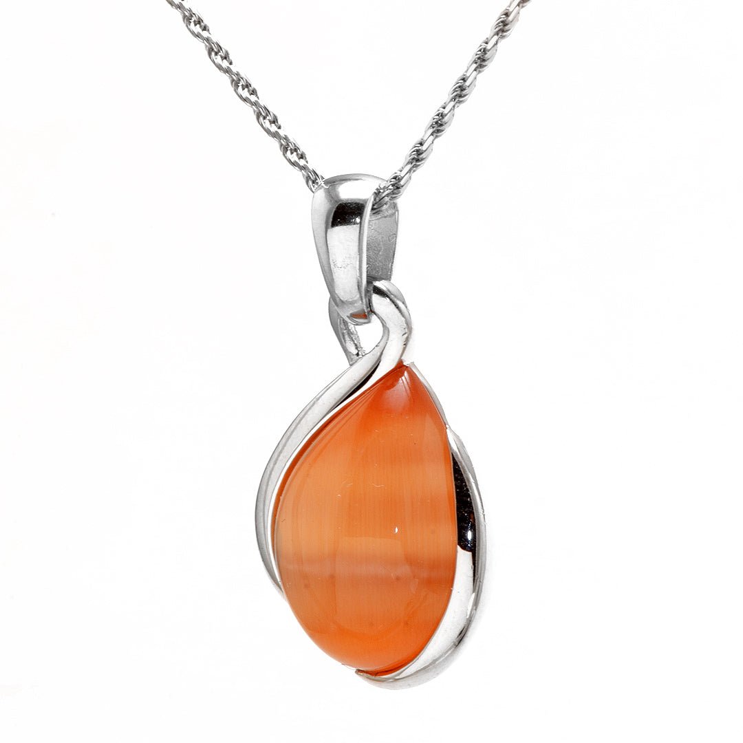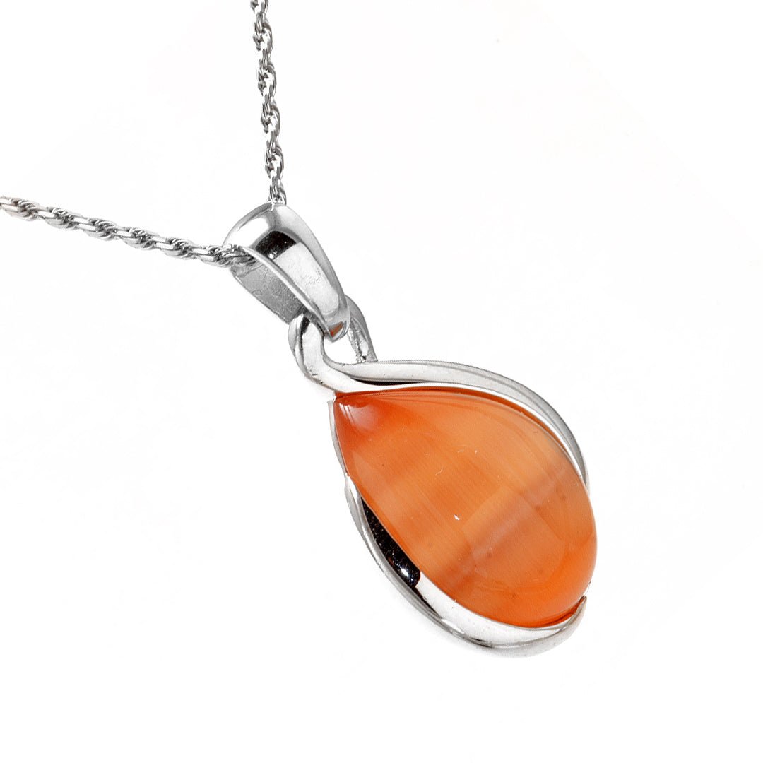 The orange cat eye stone displays a dynamic line of reflected light across its surface. This visual effect, known as chatoyancy, gives the pendant its lively character. The warm orange hue evokes a sense of warmth and energy, while the silver frame adds refinement. The stone is centered carefully within a sleek design that highlights both color and light. Together, these elements create a piece that is bold yet graceful.
