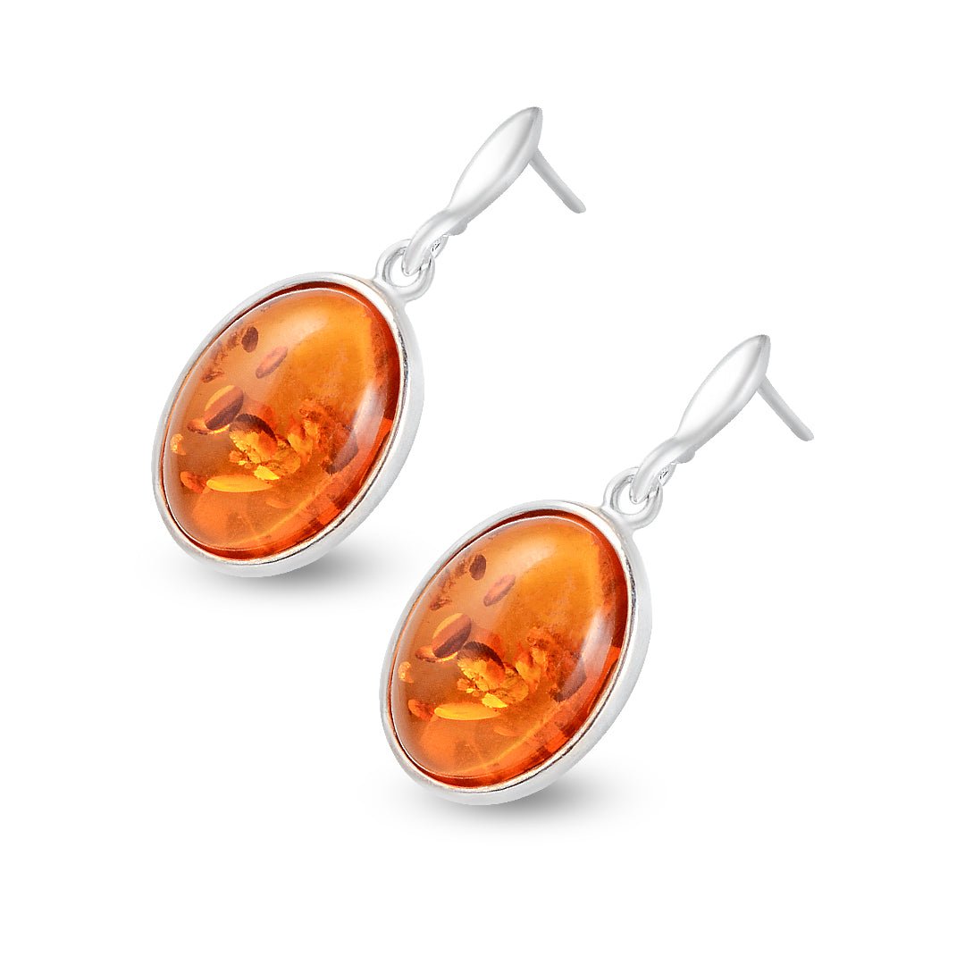 These oval amber earrings blend classic design with natural warmth. Crafted from 925 sterling silver, each earring showcases a polished amber stone in a smooth oval bezel. Moreover, the amber surface captures light in soft waves, adding depth and life to the design. As a result, they offer a subtle glow that enhances both casual and formal looks. You will enjoy their understated elegance every day. Additionally, the bezel keeps the stone secure.