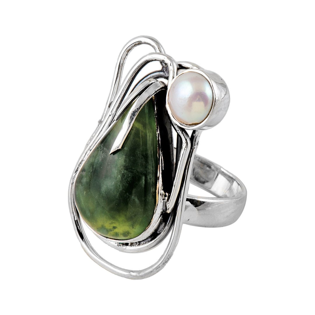 This pearl peridot silver ring blends natural radiance with graceful structure in a refined, handcrafted form. Made from 925 sterling silver, it weighs 11.98 grams, offering a substantial feel while maintaining comfort. A luminous central pearl anchors the design, flanked by fresh green peridot stones that add vibrancy. Polished curves surround the gems, creating a balanced, sculptural piece. Altogether, this pearl peridot silver ring expresses organic elegance with modern flair.
