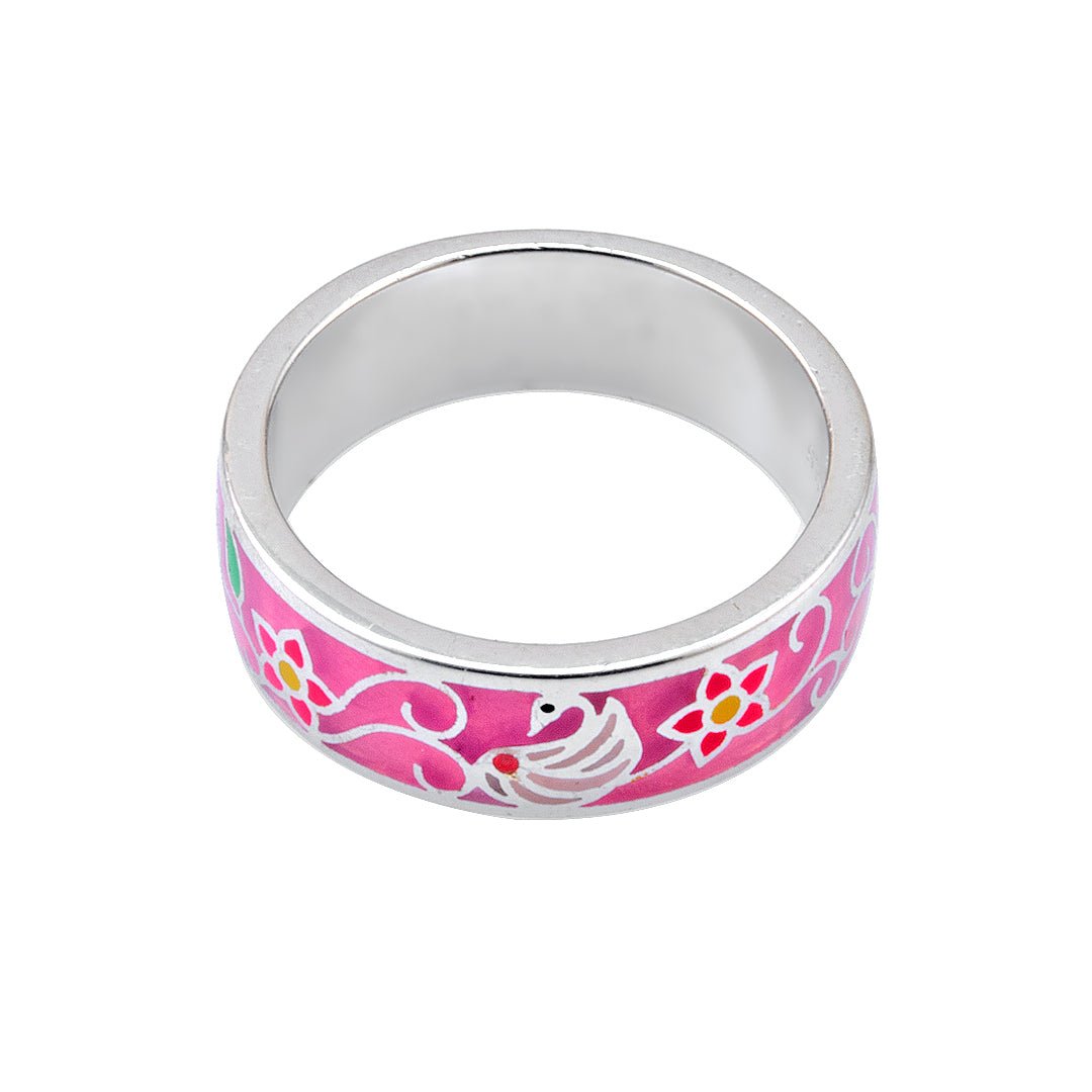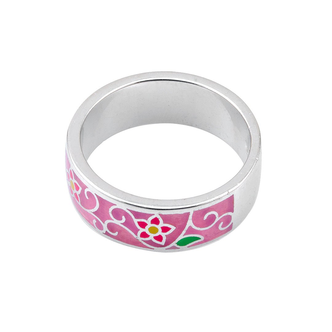 The pink detailing on this band offers a gentle contrast against the high‑polish silver background. Each flower stands out without overwhelming the design. Furthermore, transition tones blend pink and silver through finely applied accents. Therefore, the piece maintains harmony between cool metal and warm hue. Additionally, the polished edges reflect light evenly, enhancing the floral forms. Thus, the band feels cohesive and thoughtfully balanced. It pairs seamlessly with all skin tones and wardrobe palettes.