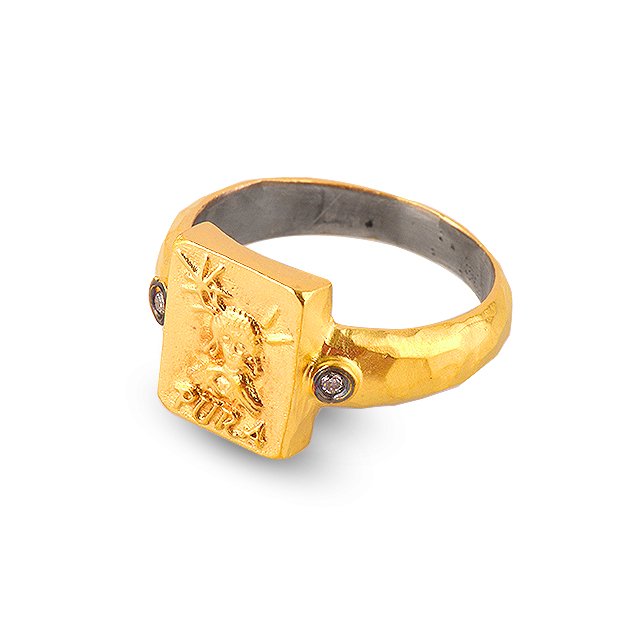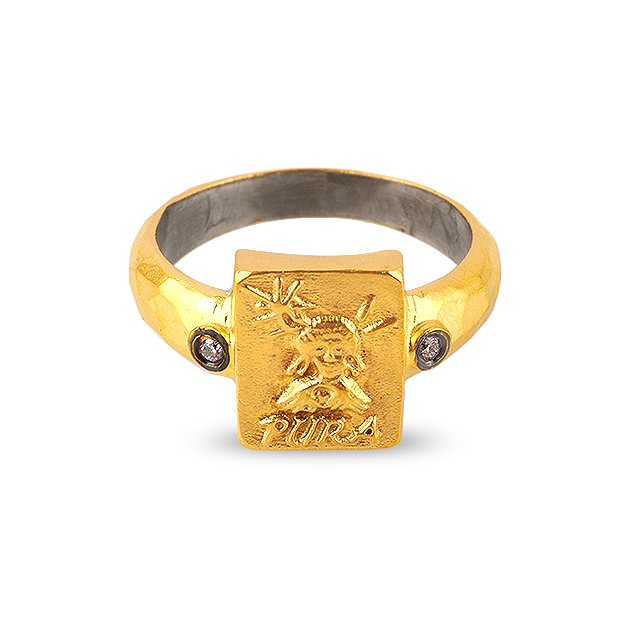 This Pura silver and gold diamond ring embodies clarity and intention in its design. It is crafted in sterling silver fused with 0.11 g of 24 kt yellow gold. The slender band curves gently around the finger, offering effortless comfort. Moreover, the engraved word “Pura” stands out against the polished metal, signaling purity of purpose. Smooth contours and subtle contrasts create a refined profile. As a result, this ring delivers both symbolic resonance and everyday wearability. It invites the wearer to carry a message of clarity everywhere they go.