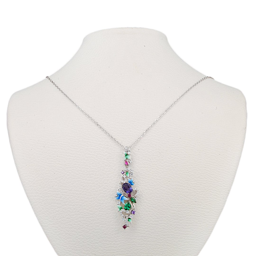This purple stone necklace captures elegance through natural form and vivid color. Crafted from 925 sterling silver, it weighs 7.78 grams and features nature-inspired detailing that surrounds a radiant violet center. The textured silver setting mimics organic shapes, while the purple stone adds a bold focal point. This purple stone necklace balances earthy charm and refined brilliance. Moreover, its striking composition invites both admiration and everyday wear.