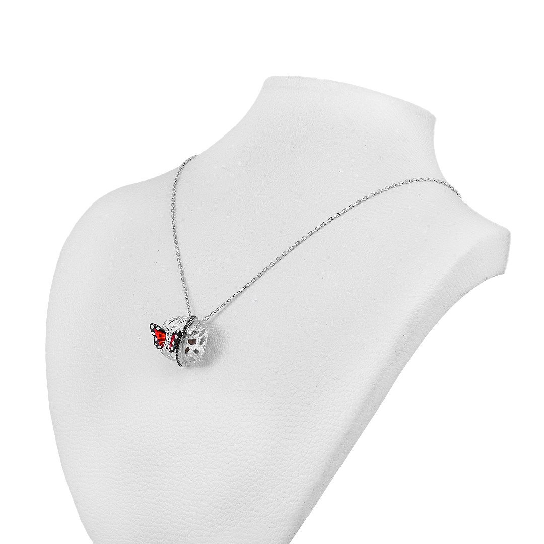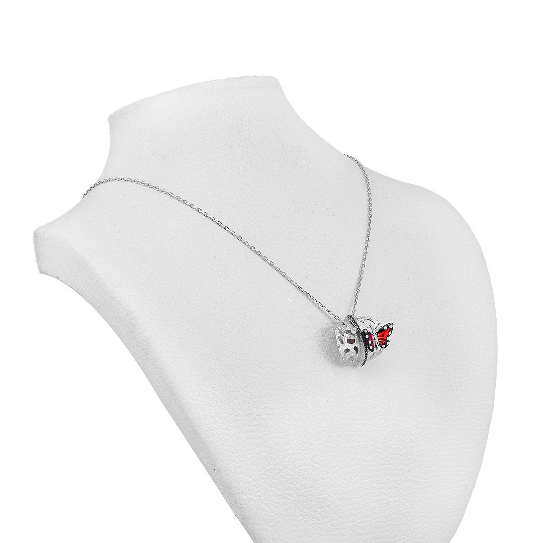 The butterfly’s wings blend rich red and deep black in an elegant composition. Each wing is shaped to suggest motion and delicacy. Furthermore, the polished silver edges enhance the color while offering soft light reflection. This balance of color and form makes the necklace eye-catching without being overpowering. It’s a statement of grace and strength.