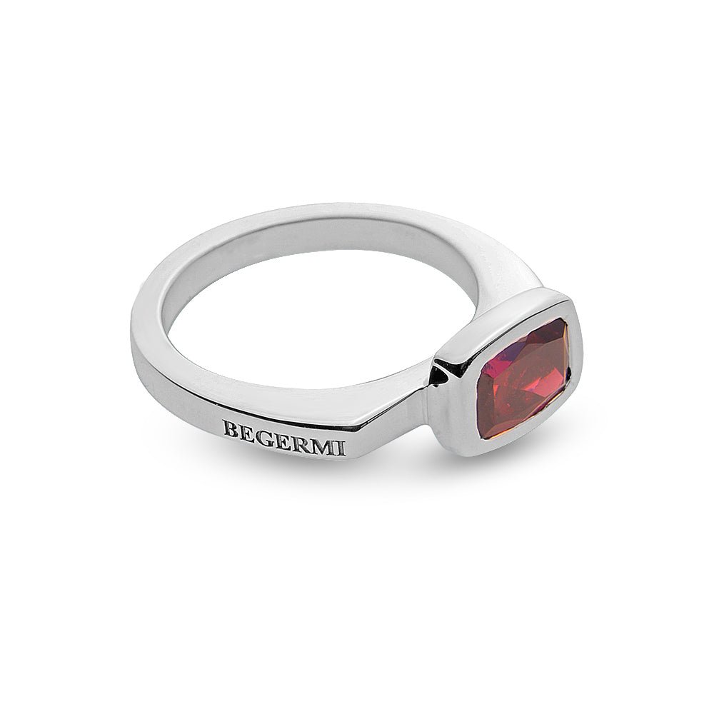 The rhodolite shows a vivid wine-pink tone that feels rich and memorable. Set against polished silver, the gem becomes the visual anchor. The cool metal amplifies the stone’s saturation and depth. Thus, the contrast produces a dynamic, luxurious appearance. Clean edges and a smooth finish reflect the S. Begermi aesthetic. Therefore, the piece remains expressive without excess and feels timeless.