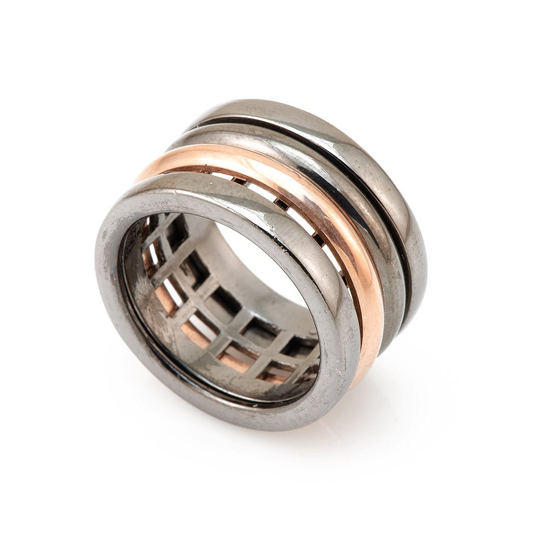 The rose gold accent adds warmth and softness, while the bright silver brings clarity and shine. The grey brushed band between them provides subtle contrast and depth. These colors interact beautifully, creating a harmonious yet bold appearance. This combination gives the ring a rich visual language, while remaining easy to style.