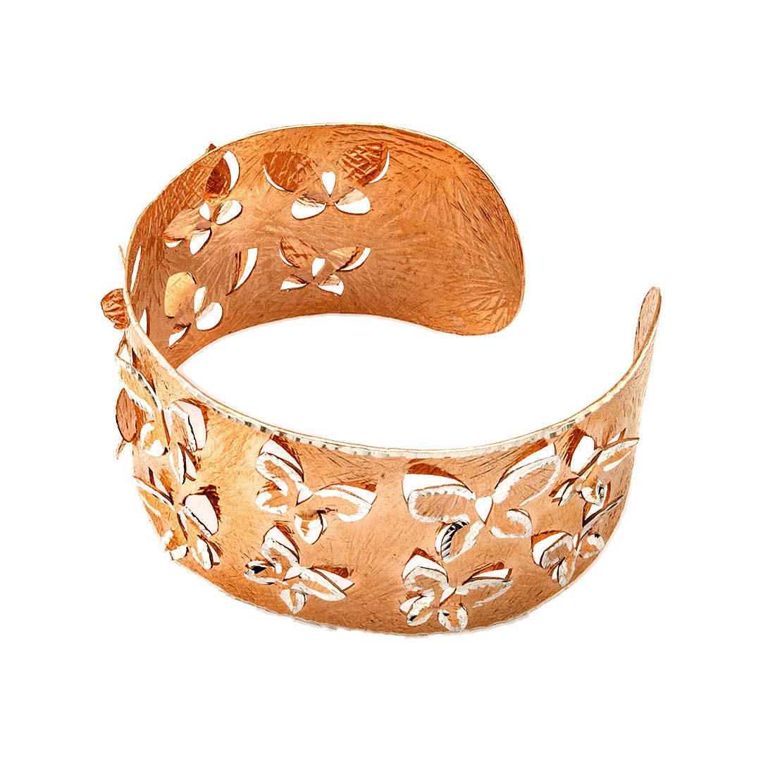 This bracelet is ideal for anyone drawn to graceful, nature-inspired jewelry. The butterfly symbols evoke transformation, lightness, and freedom. Whether worn on its own or stacked with simpler pieces, it remains the focal point of your look. The warm tone and sculptural elements lend it versatility. It pairs beautifully with soft fabrics, floral prints, or minimalist ensembles. In essence, this is a statement of gentle sophistication.