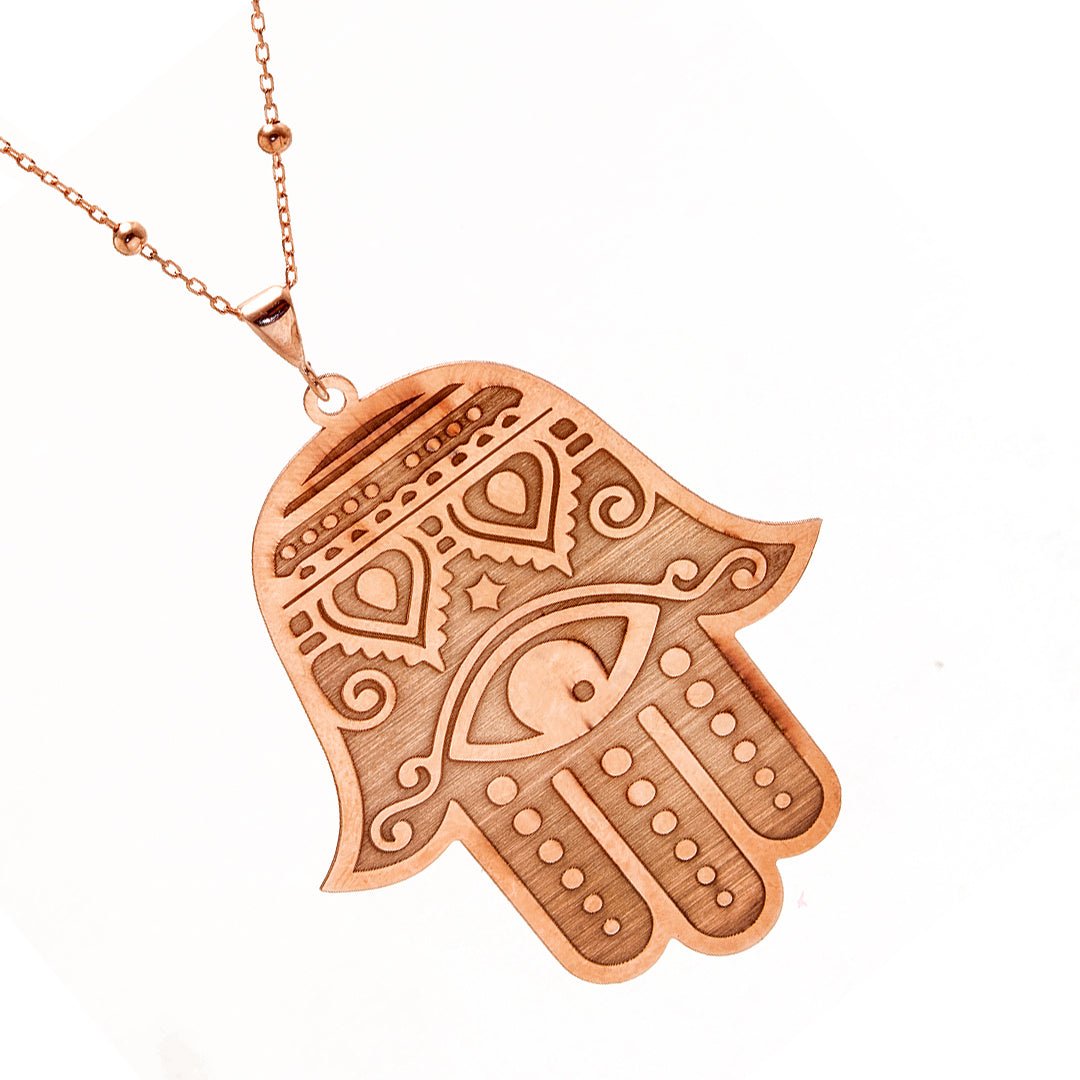 The pendant’s hand shape reflects traditional protection, while the evil eye adds another layer of symbolic strength. Its polished surface catches light gently, bringing out the soft tone of the rose gold finish. Worn close to the heart, it becomes a personal emblem of energy, grace, and grounding.