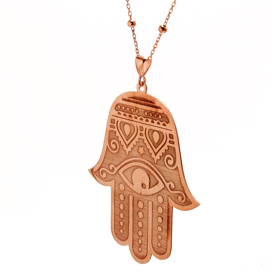 This rose gold evil eye necklace blends symbolism and polish in a distinctive design. Crafted from 925 sterling silver and finished in a warm rose gold color, the pendant features a hand motif with a central evil eye. Its smooth curves and spiritual significance make it a piece of both beauty and intention.