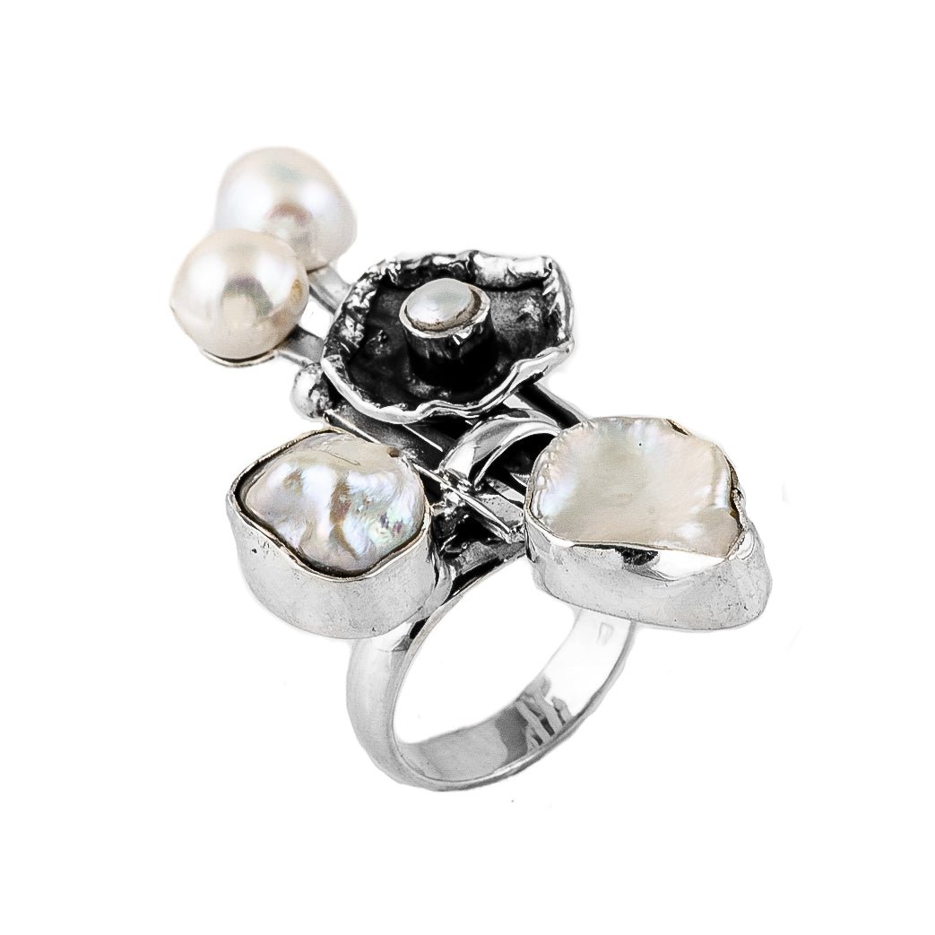 The ring’s design is thoughtfully sculpted, with silver flowing around the pearl in a seamless curve. Each surface reflects light, highlighting the smooth structure and polished finish. The mother of pearl glows with a soft, creamy shimmer. It adds contrast and warmth to the cool-toned silver. As a result, the sculpted mother pearl ring becomes a true statement of modern beauty. The form feels intentional and expressive, without being overwhelming.