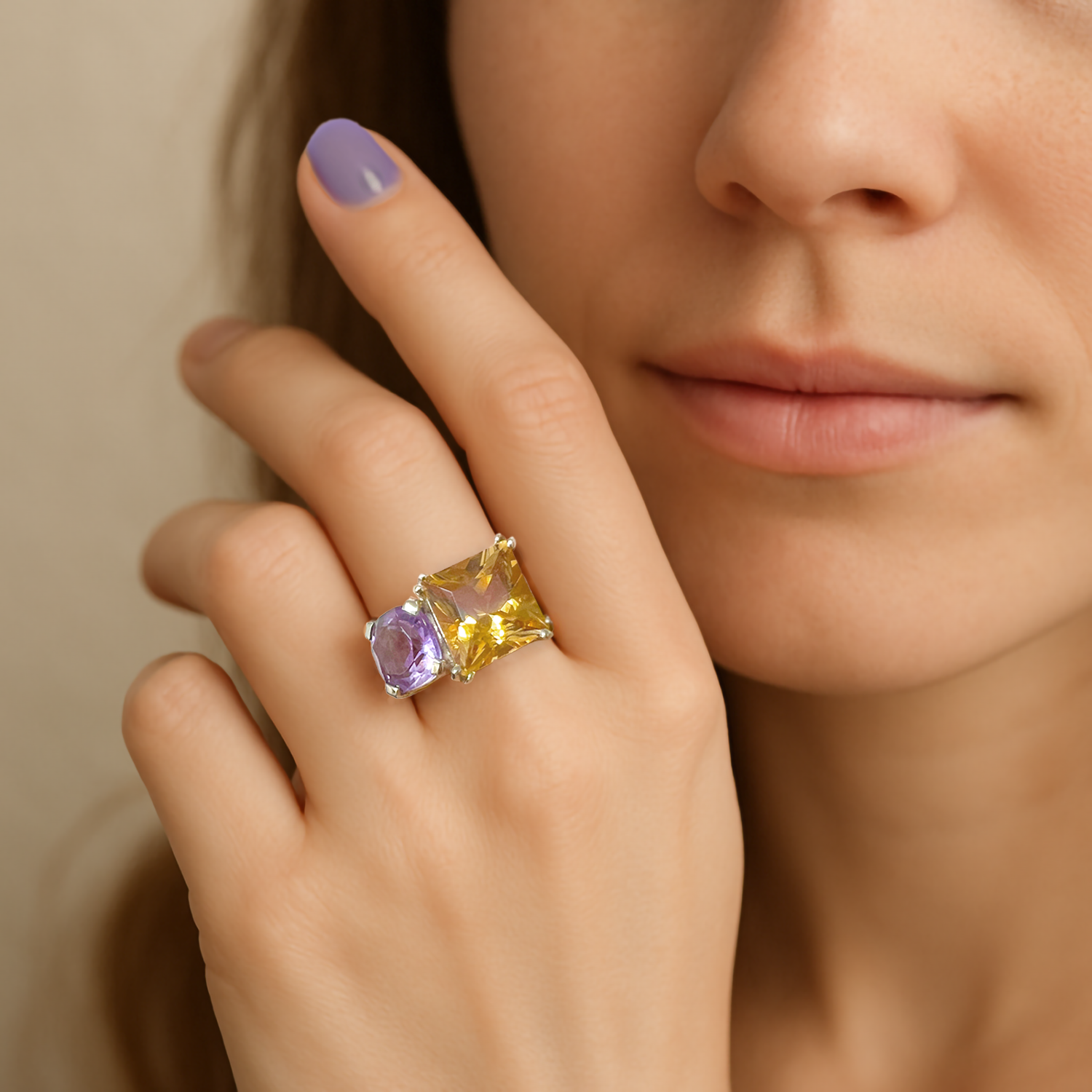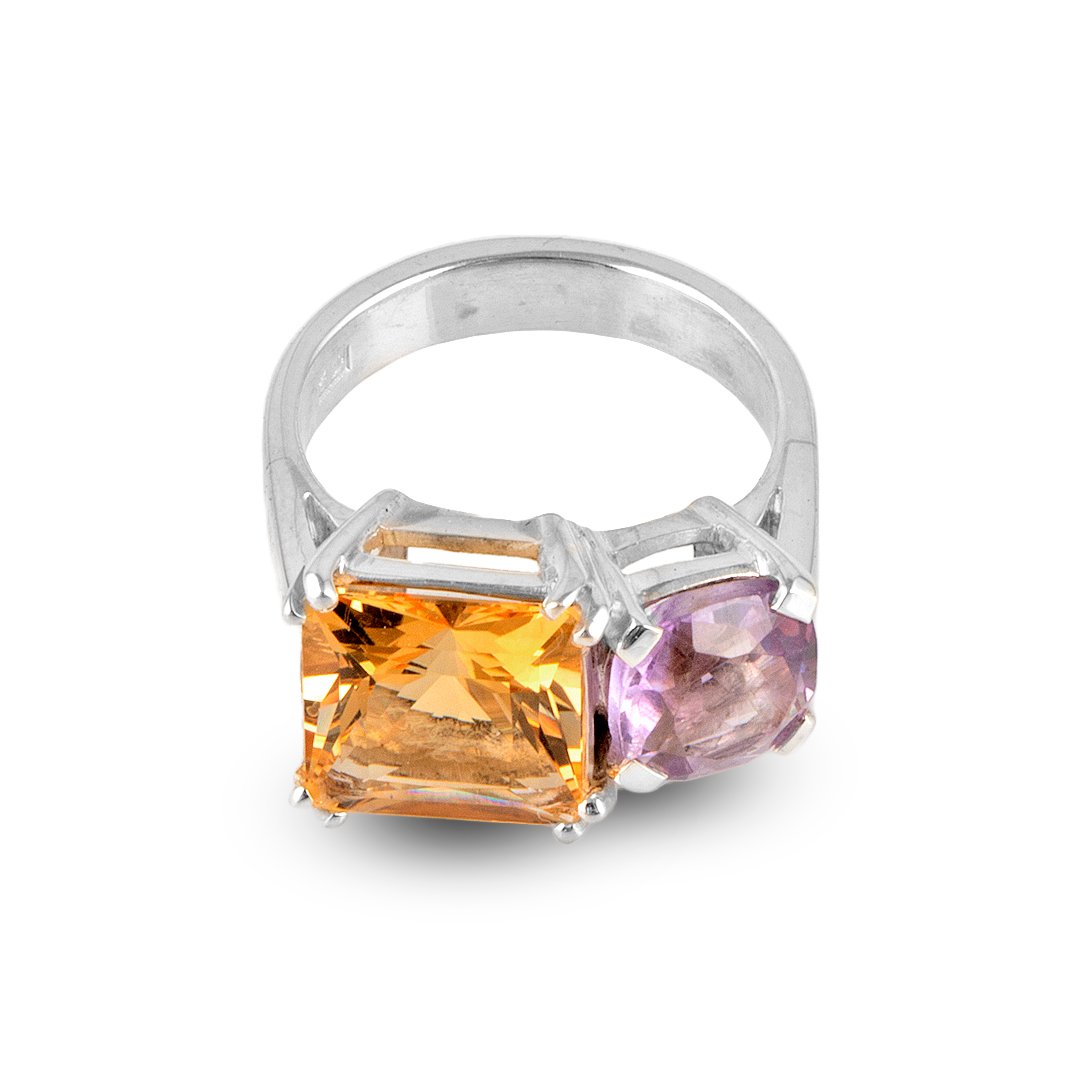 This natural citrine and amethyst silver ring celebrates vibrant gemstone pairing and modern form. Crafted in 925 sterling silver, it weighs 6.85 grams. A 4.90‑carat citrine commands center stage. A 2.05‑carat amethyst flanks it with gentle harmony. Polished bezel settings secure both stones with silent strength. Smooth band curves rest lightly against skin. Moreover, golden accents within the silver add subtle warmth. The natural citrine and amethyst silver ring design invites expressive layering. Daily wear meets striking allure in every detail. It transitions seamlessly from casual day to formal evening.