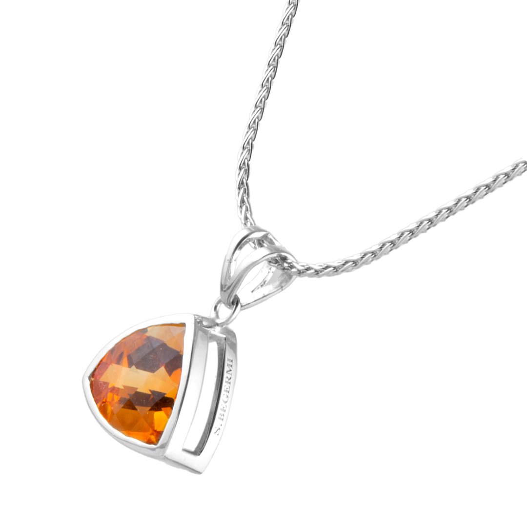 The Silver and Citrine S.Begermi Pendant captures sunlight with refined restraint. Crafted in 925 sterling silver, the pendant frames a single natural citrine weighing 7.20 carats. Its golden hue radiates warmth and clear brilliance with every gentle movement. Moreover, the polished silver enhances the stone’s glow while preserving elegant simplicity. Each line is measured for proportion, creating a silhouette that flatters the neckline.