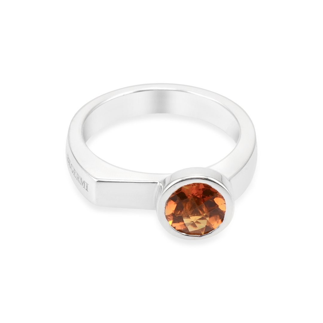 The Silver and Citrine S. Begermi Ring captures sunlight in a refined form. Crafted in 925 sterling silver, the band shows a careful polish and balance. Moreover, the natural citrine glows with a golden tone that delights the eye. Each curve enhances the gem while keeping the overall design elegantly simple. Also, the ring layers easily with bracelets or other slim bands for effect. Consequently, the design feels both modern and timeless, suitable for daily wear. Its slender profile enhances stacking and layering options. Moreover, the craftsmanship invites close inspection and quiet admiration. Each ruby’s polish enhances contrast and depth.