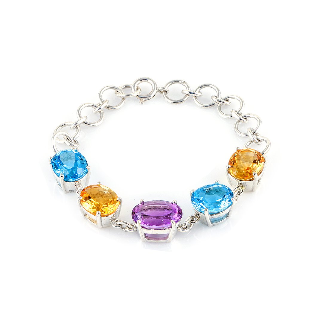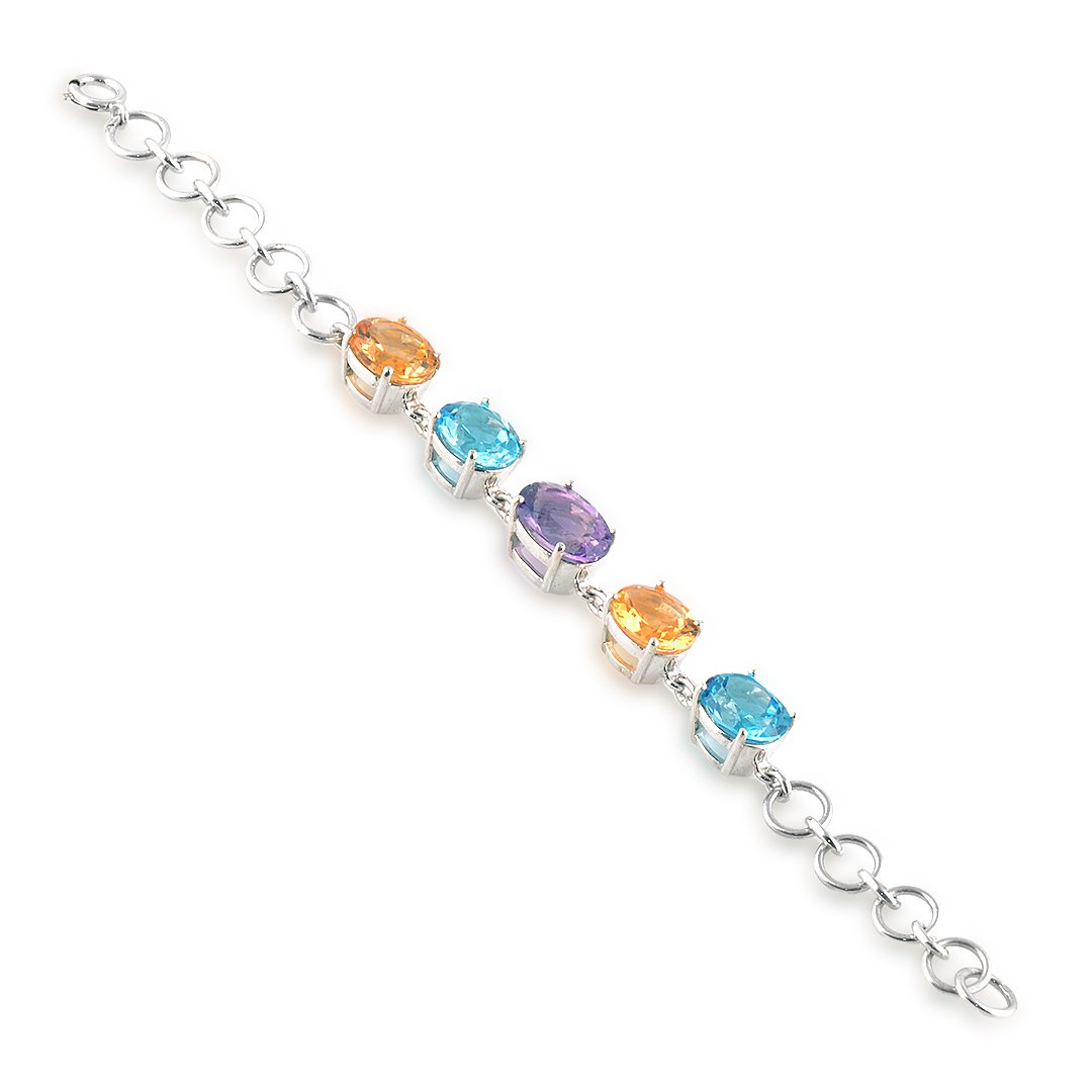 Natural amethyst introduces depth with rich violet notes. Meanwhile, citrine brings sunny warmth and clear sparkle. Likewise, blue topaz offers cool brightness and crisp clarity. Together, these stones create a balanced palette that suits varied wardrobes. Moreover, their cuts and settings maximize light and color for lively shimmer. Each gem is selected for consistent tone and clarity. As a result, the bracelet captures attention without overwhelming an outfit.