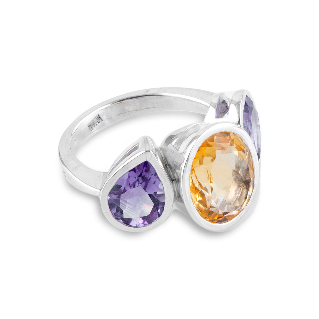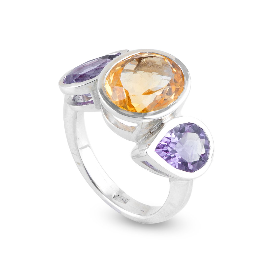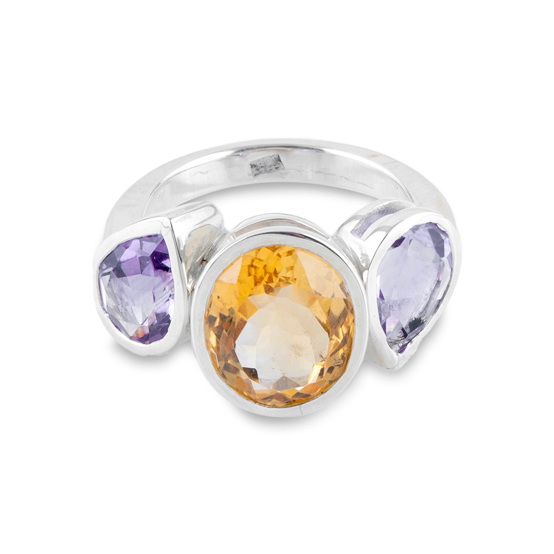 The natural citrine and amethyst silver ring theme shines through with balanced gemstone play. Light enters the 4.43-carat citrine and refracts across polished surfaces. Moreover, the two amethysts deliver rich purple contrast alongside the vibrant center gem. Their strategic placement amplifies visual depth and symmetry. Additionally, subtle inclusions within each stone add character and authenticity. Consequently, the gemstones transform simple silver into a dynamic canvas of light and color. This arrangement honors both nature’s artistry and masterful gem setting.