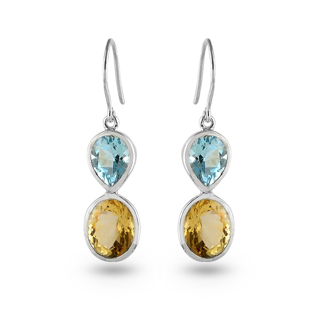 The citrine stones total 7.60 carats, glowing like captured sunshine. In turn, the blue topaz stones add 14.28 carats of serene, sky‑blue sparkle. Together, they offer dynamic contrast: one stone invites warmth, the other suggests calm. Light dances across their facets, revealing hidden hues in every shift. Their careful placement within the silver drop setting maximizes brilliance and visibility.