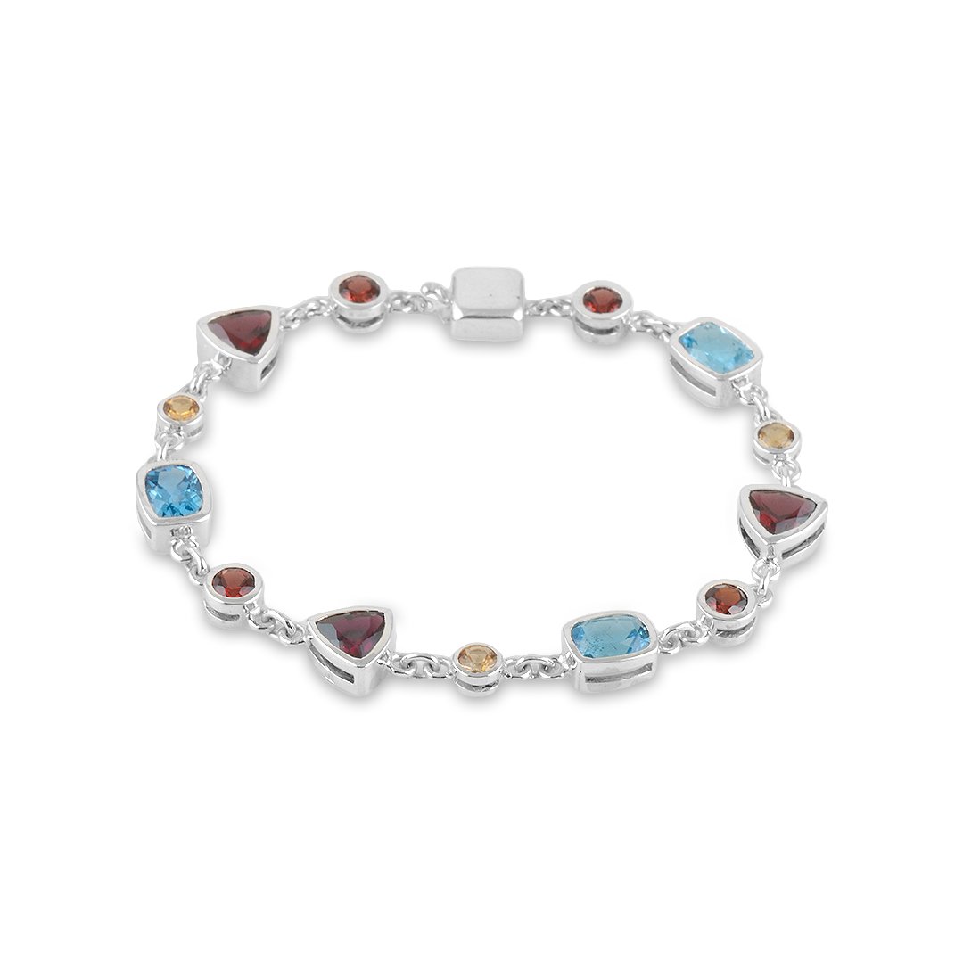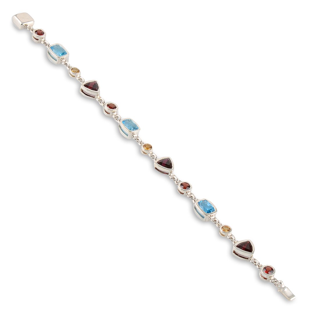 The Silver, Citrine, Garnet and Blue Topaz Bracelet combines artistry with refined craftsmanship. Created in 925 sterling silver, it carries a graceful weight of 12.15 grams. Moreover, the polished finish enhances its radiance, reflecting light with subtle brilliance. This balance of silver and vibrant stones makes the bracelet timeless. Consequently, it feels both contemporary and classic, allowing it to adapt seamlessly to many styles. Its smooth finish also ensures comfort for daily wear, elevating elegance effortlessly.