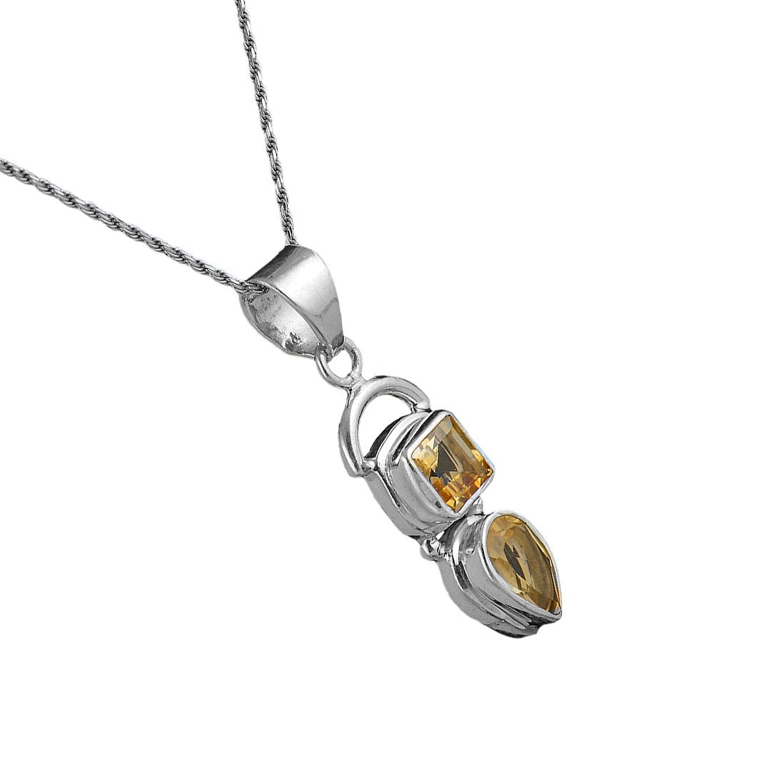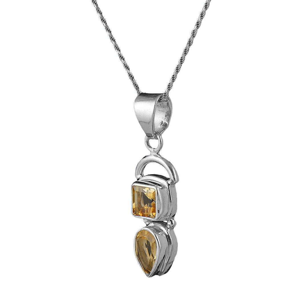 At the center sits a golden citrine that brings warmth and color to the polished silver. Its natural glow contrasts beautifully with the cool tone of the silver. Moreover, the citrine is precisely set to enhance light reflection across its surface. The rich yellow hue creates a radiant focal point. As a result, this silver citrine pendant draws the eye without overpowering the overall form. The combination of color and texture offers timeless appeal.