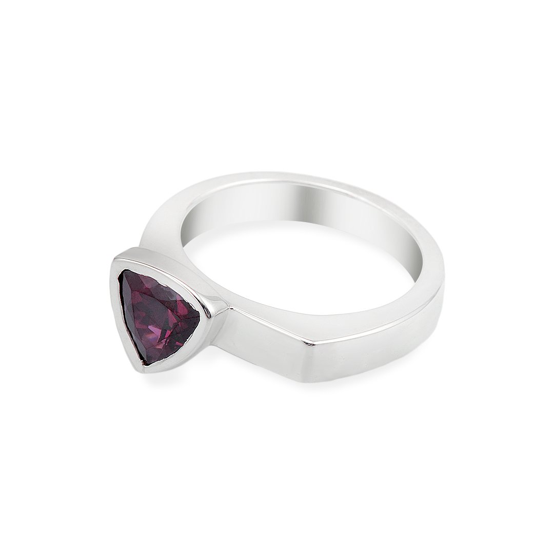 The Silver Garnet S.Begermi Ring showcases a natural garnet set in smooth 925 sterling silver. The gemstone presents a deep red tone with controlled brilliance. Its color adds warmth and visual depth. Meanwhile, the polished silver setting enhances contrast and clarity. As a result, the ring appears refined and well balanced. The design remains elegant without unnecessary complexity.