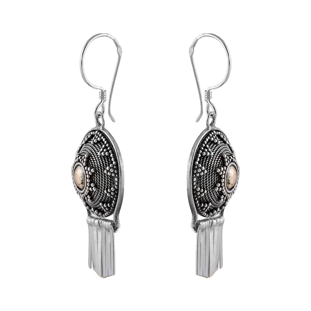 These silver gold earrings offer a striking blend of shine and contrast in a graceful design. Crafted from 925 sterling silver and weighing 5.61 grams, each earring features a polished silver frame with a gold-plated center. This radiant combination of cool and warm tones adds dimension and elegance to a compact, wearable piece. As a result, the silver gold earrings balance minimalism with artistic flair. Moreover, they transition effortlessly from daywear to evening style.