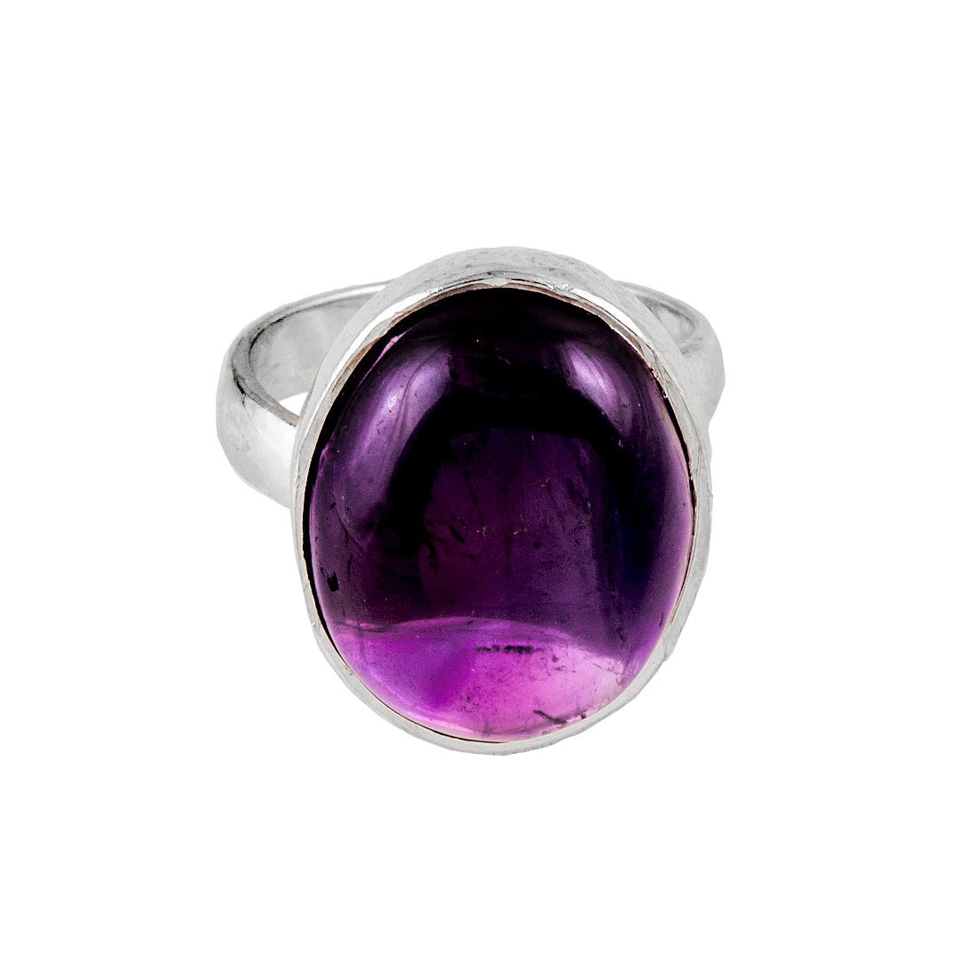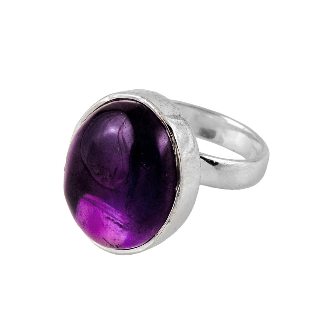 At the heart of the design sits a richly colored amethyst that stands out against the silver’s shine. Its vibrant hue adds depth and focus to the ring’s architectural lines. Whether viewed in natural light or evening glow, the gemstone offers a luminous, almost meditative quality. As a result, it delivers presence without overpowering the hand.
